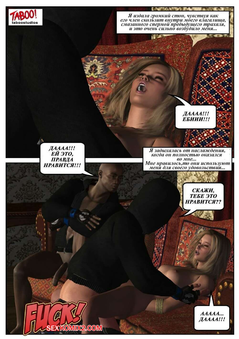 Порно комикс 50 оттенков чёрного. Часть 4 Горячая сисястая блондинка вновь встречается с черным пареньком. Она раздевается перед ним и сосет его большой хуй, после чего он ее хорошенько трахает, доставляя ей огромное удовольствие.