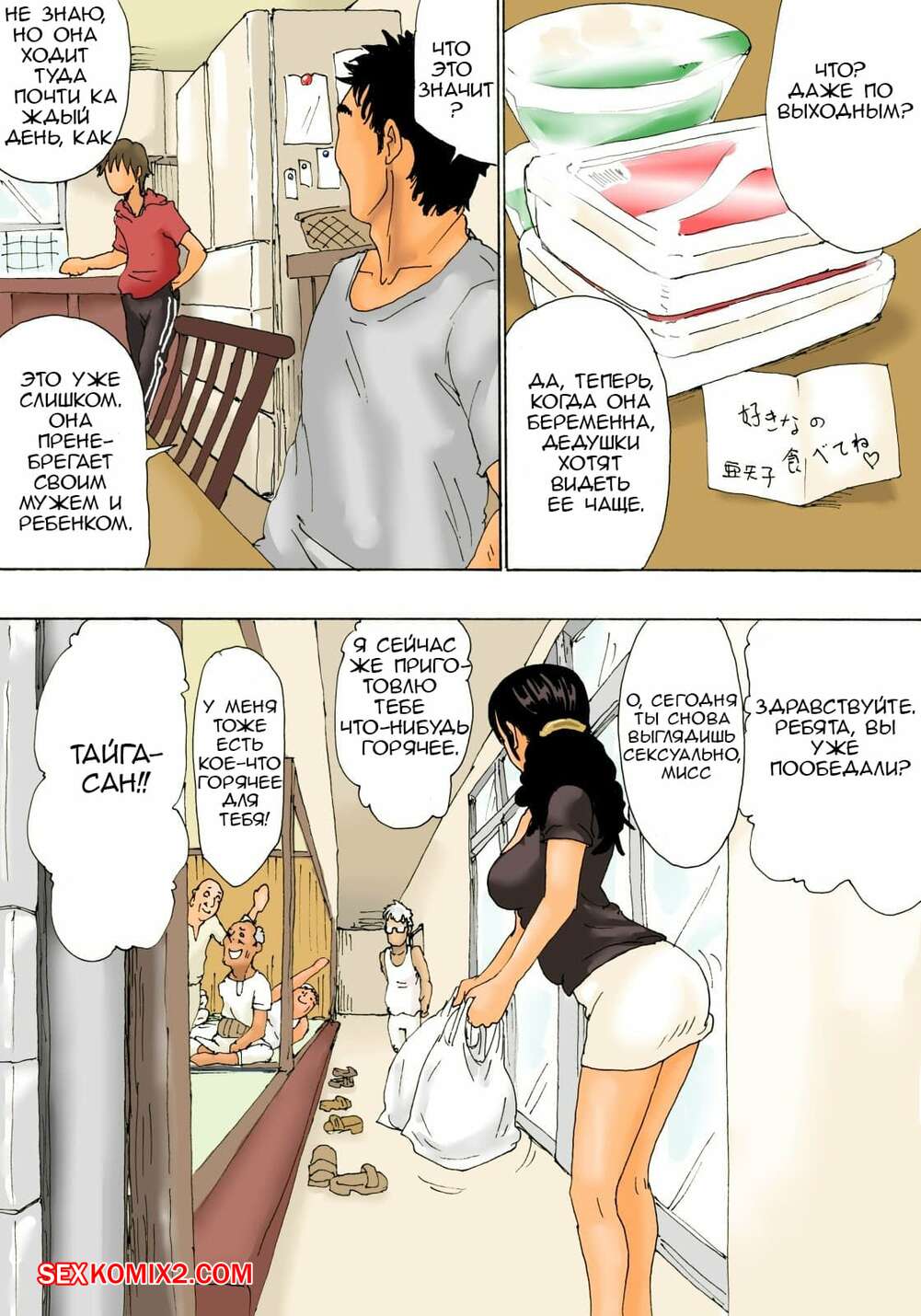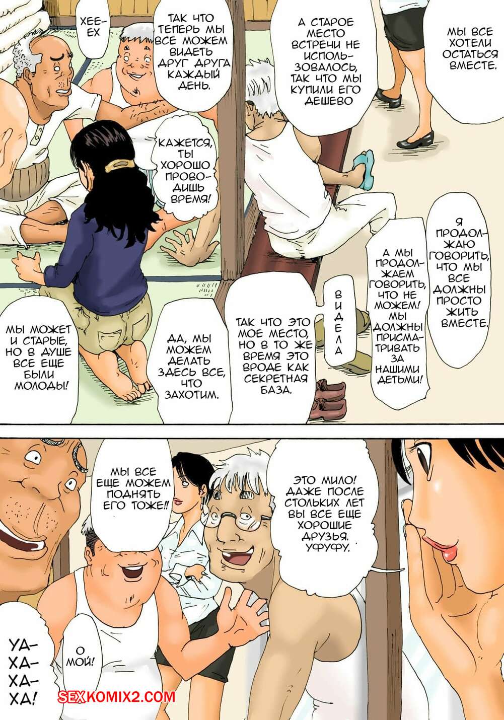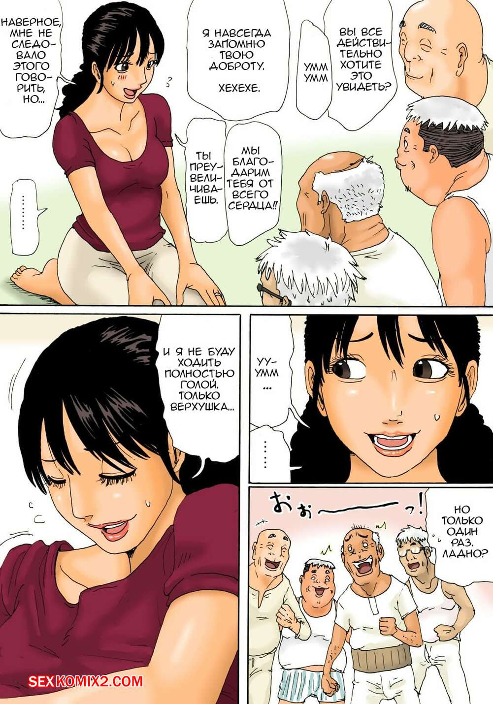 Порно комикс Домохозяйка и старики. Otoko no Naka ni Onna ga Hitori Сисястая милфа брюнетка встретилась с несколькими стариками соседями и решила повеселиться. Она разделась перед ними и стала сосать их большие хуи, после чего дала им себя выебать и кончить в нее.
