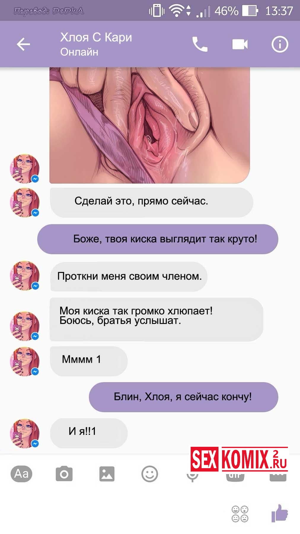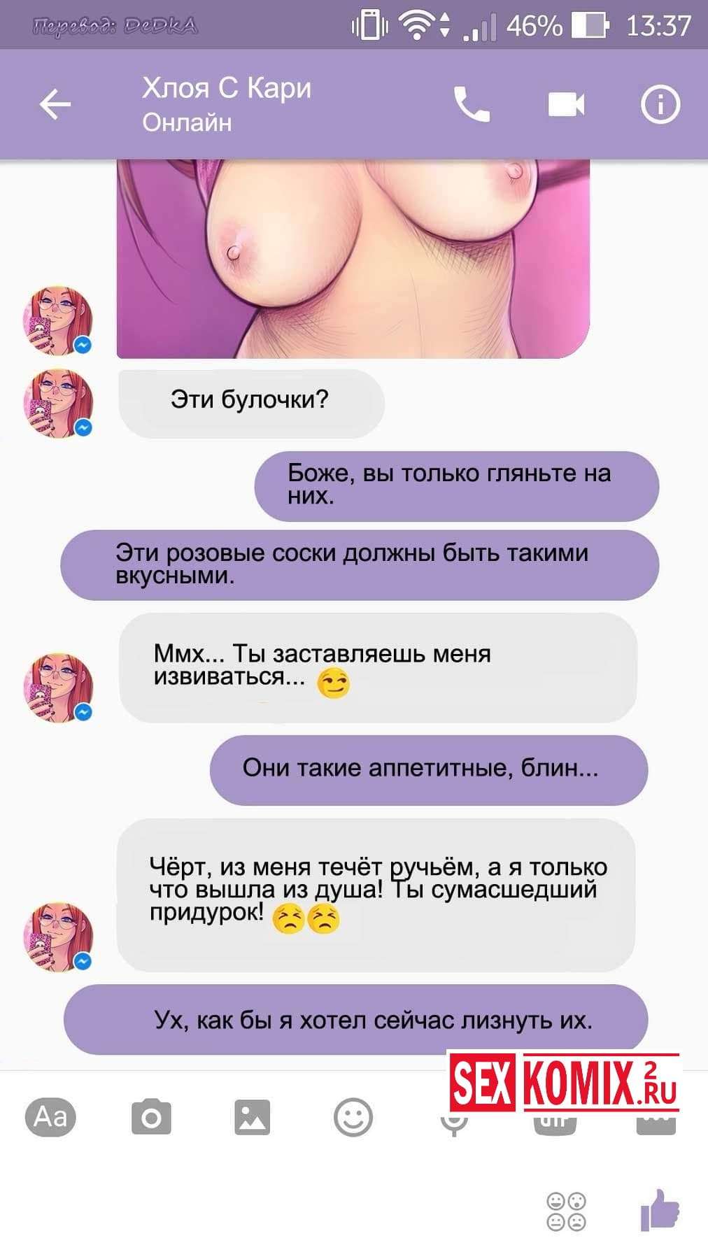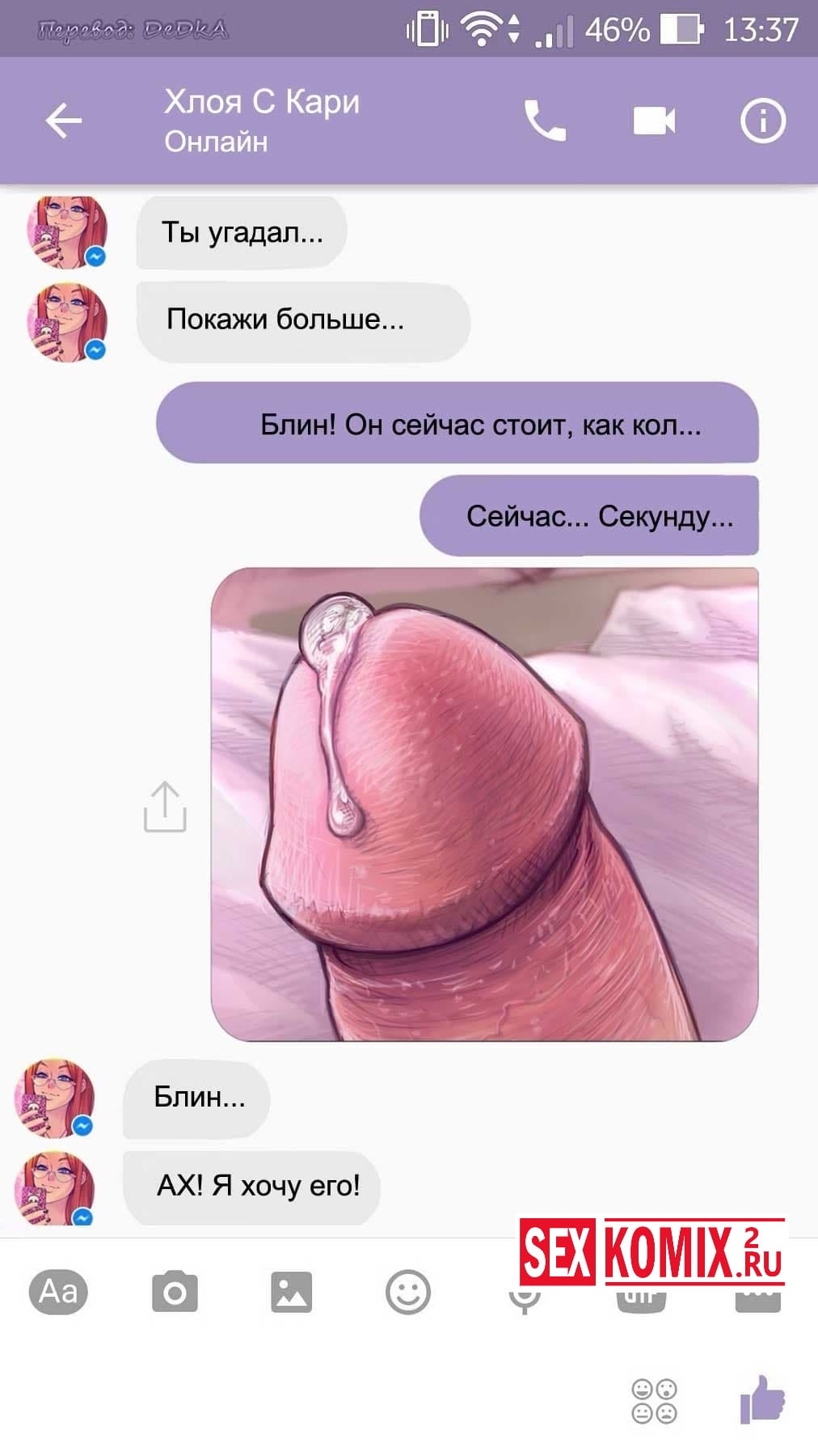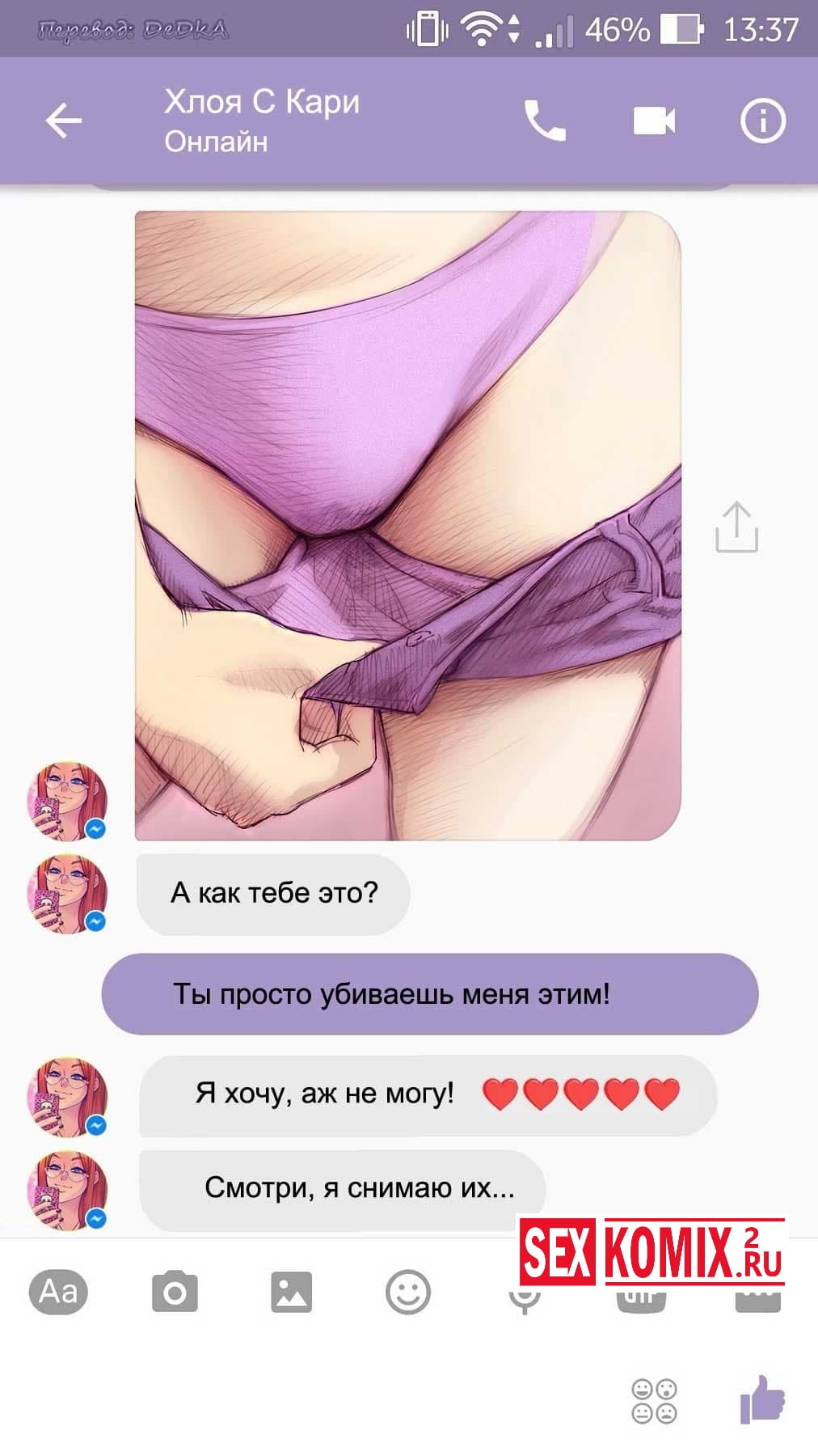 Читайте Порно комикс Чат с Хлоей. Этот секс комикс о развращенной девушке, она переписывается с незнакомцем в секс чате. И парень отправил ей фото своего большого члена и девушка потекла и в ответ начала слать свои обнаженные фотографии. Всю переписку этих ребят вы можете прочитать в комиксе.