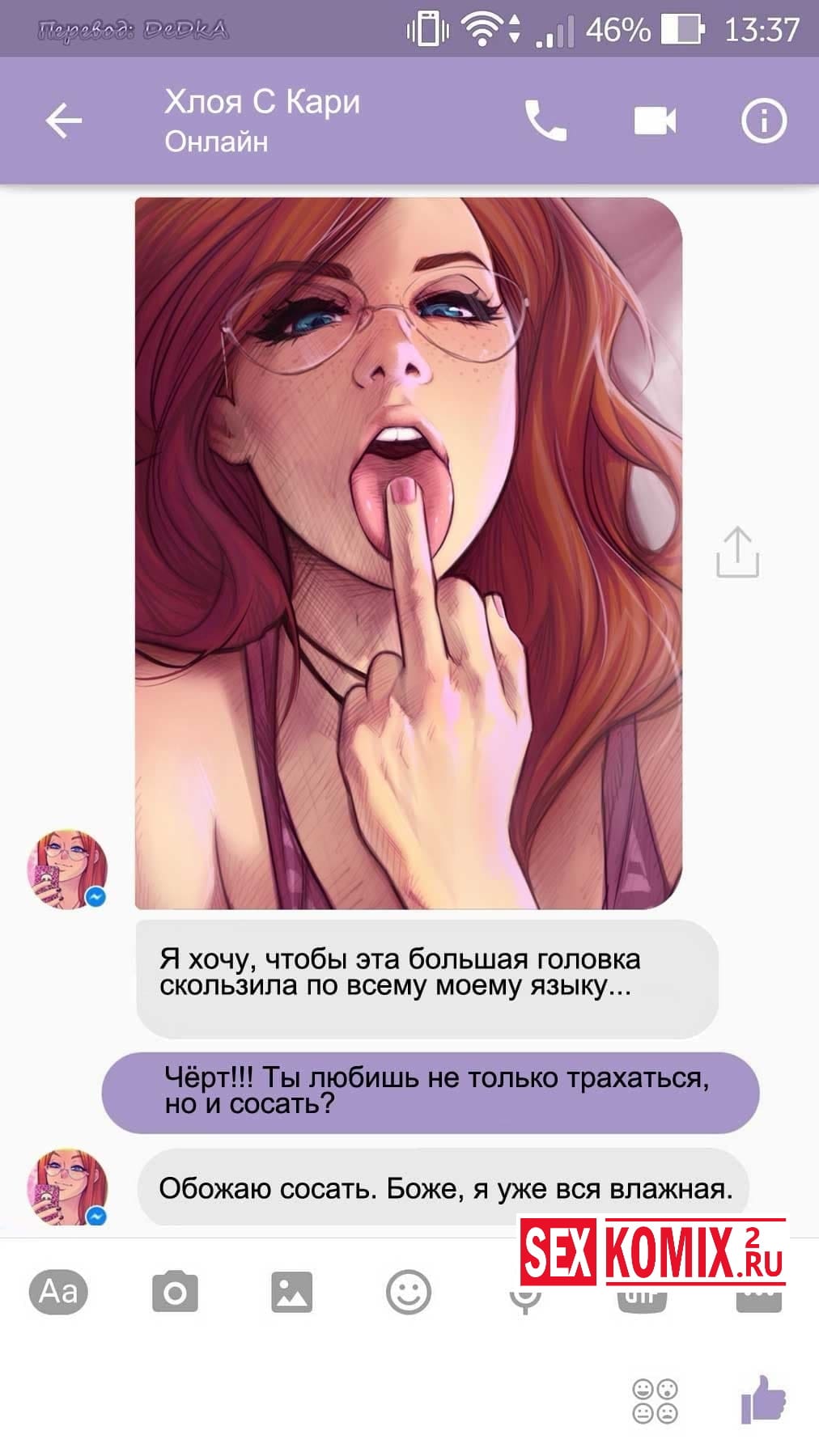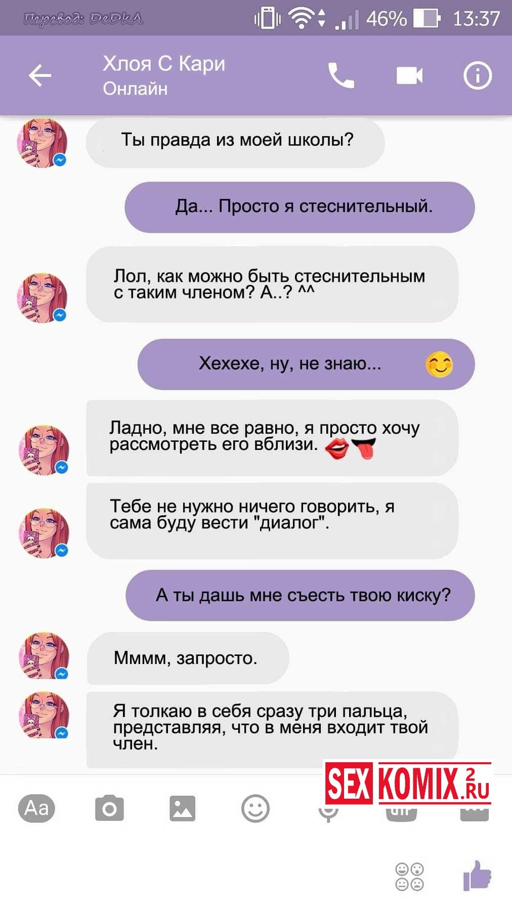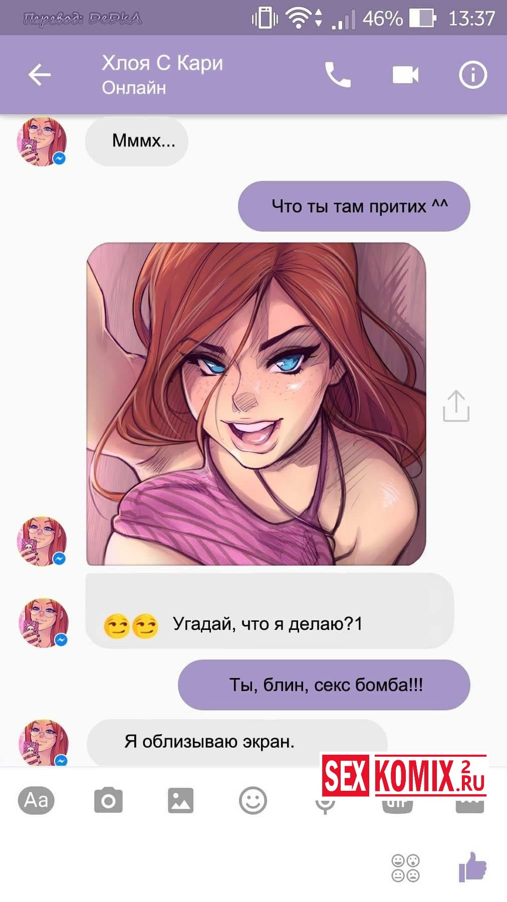 Читайте Порно комикс Чат с Хлоей. Этот секс комикс о развращенной девушке, она переписывается с незнакомцем в секс чате. И парень отправил ей фото своего большого члена и девушка потекла и в ответ начала слать свои обнаженные фотографии. Всю переписку этих ребят вы можете прочитать в комиксе.