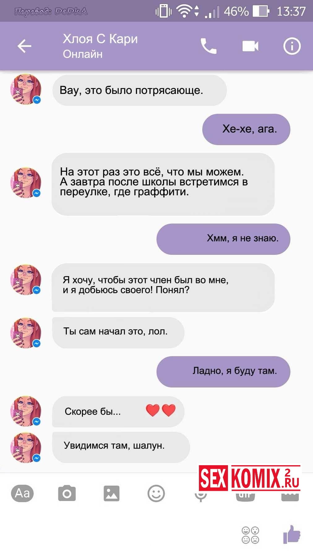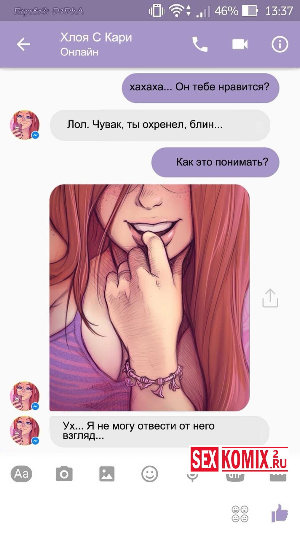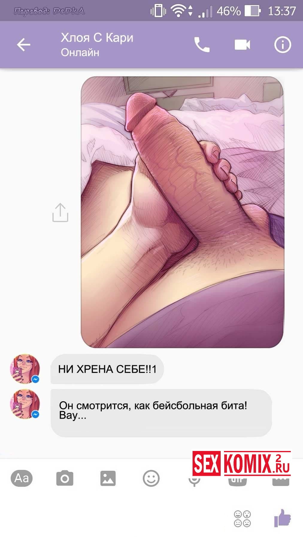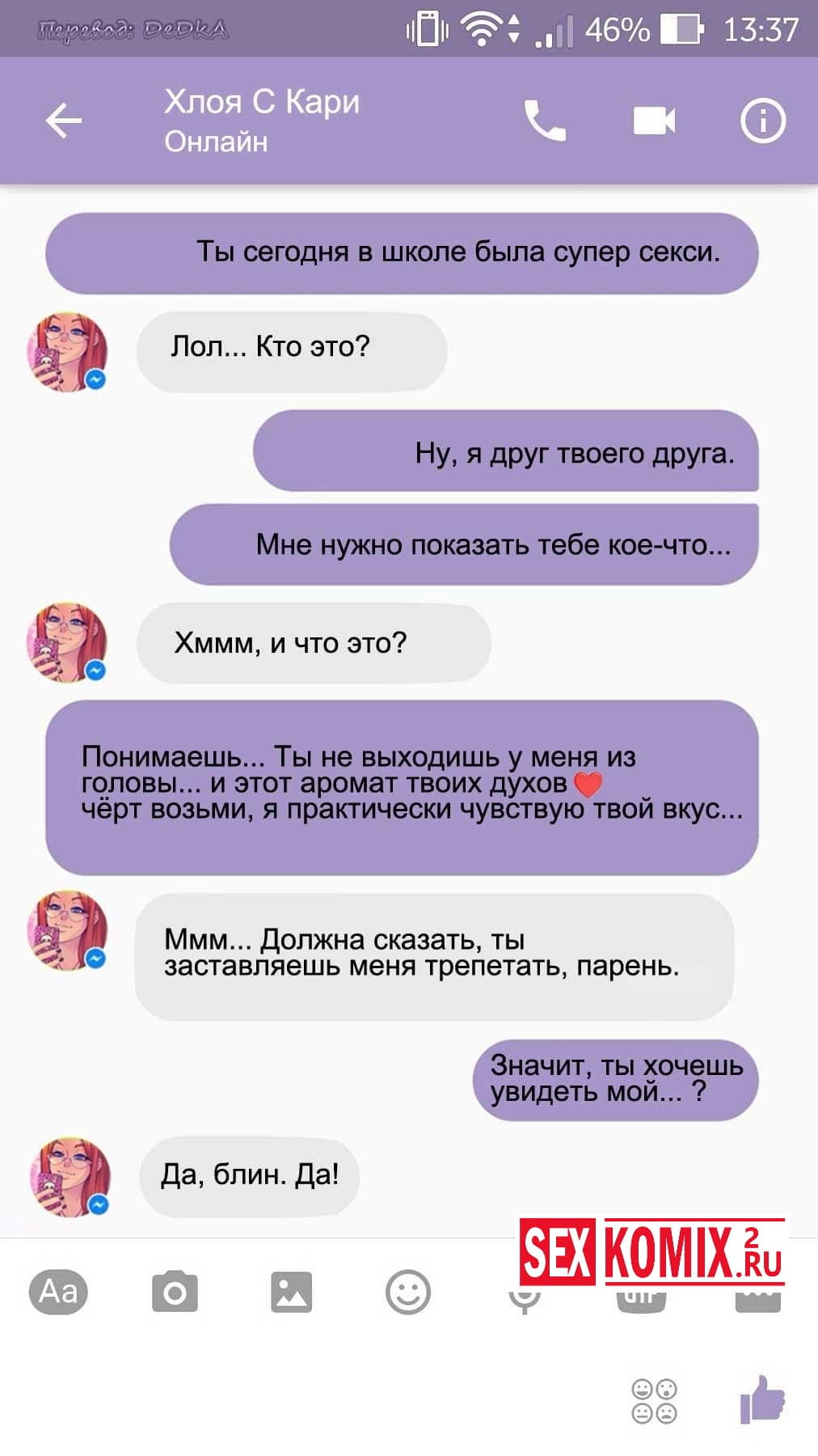 Читайте Порно комикс Чат с Хлоей. Этот секс комикс о развращенной девушке, она переписывается с незнакомцем в секс чате. И парень отправил ей фото своего большого члена и девушка потекла и в ответ начала слать свои обнаженные фотографии. Всю переписку этих ребят вы можете прочитать в комиксе.