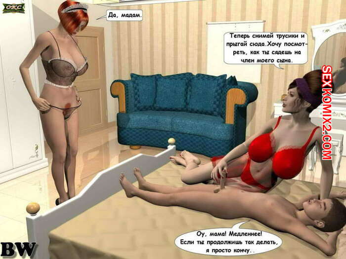 Порно комикс Горничная Парень решил повеселиться с горячей рыжей горничной. Он позвал ее к себе в комнату где она стала трахаться с ним, после чего к ним присоединилась мамка парня и они все вместе занялись групповой еблей.