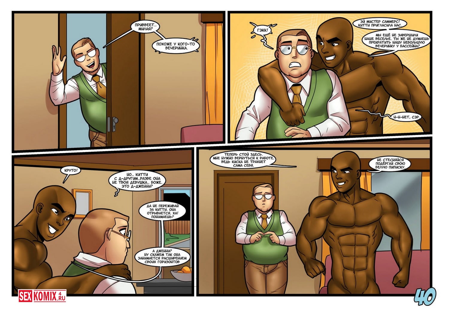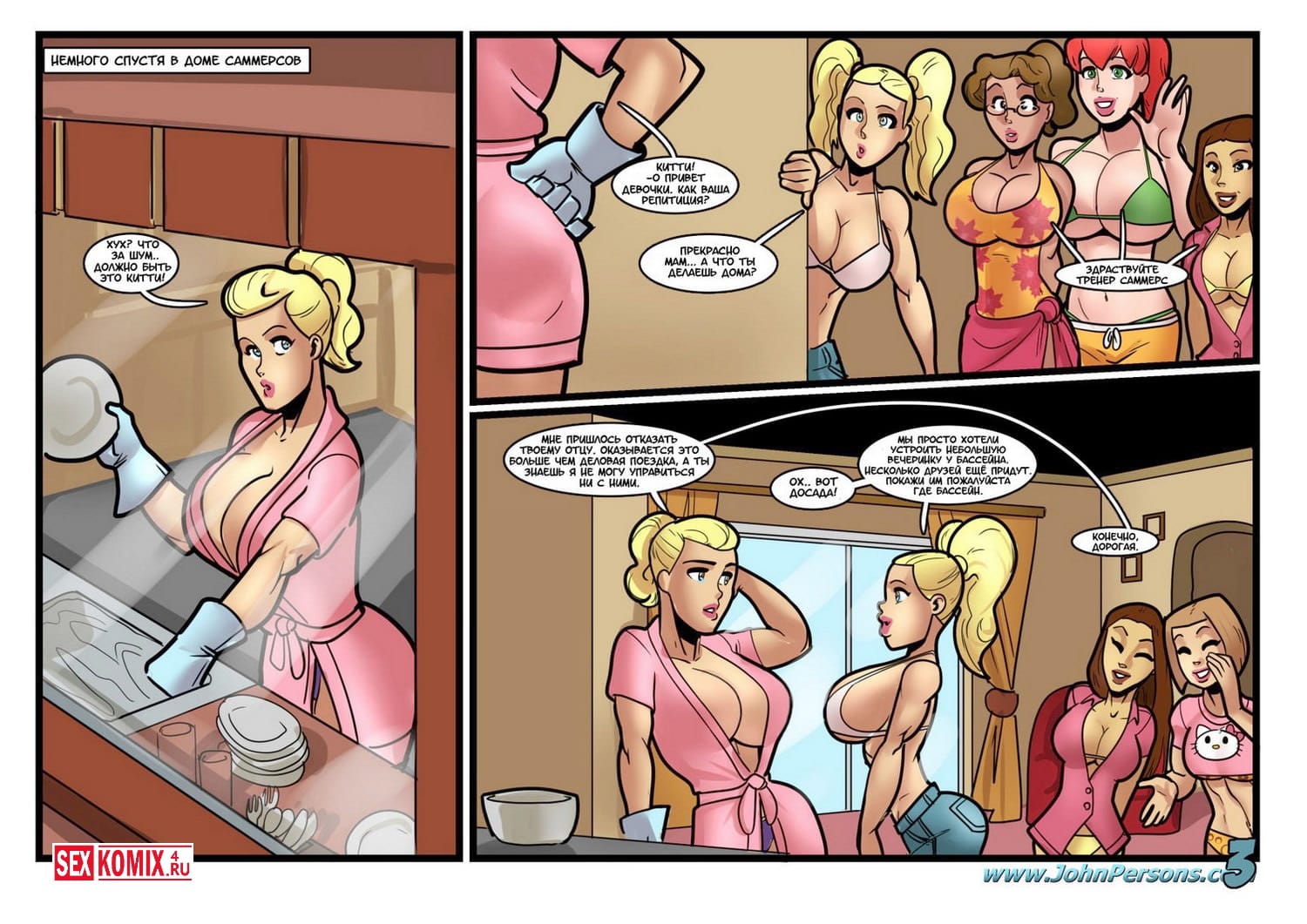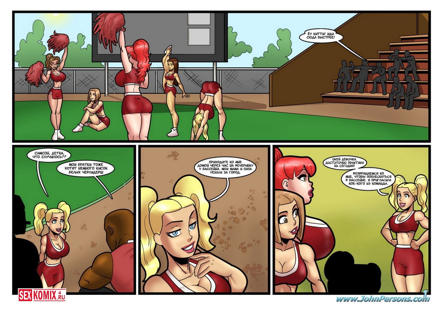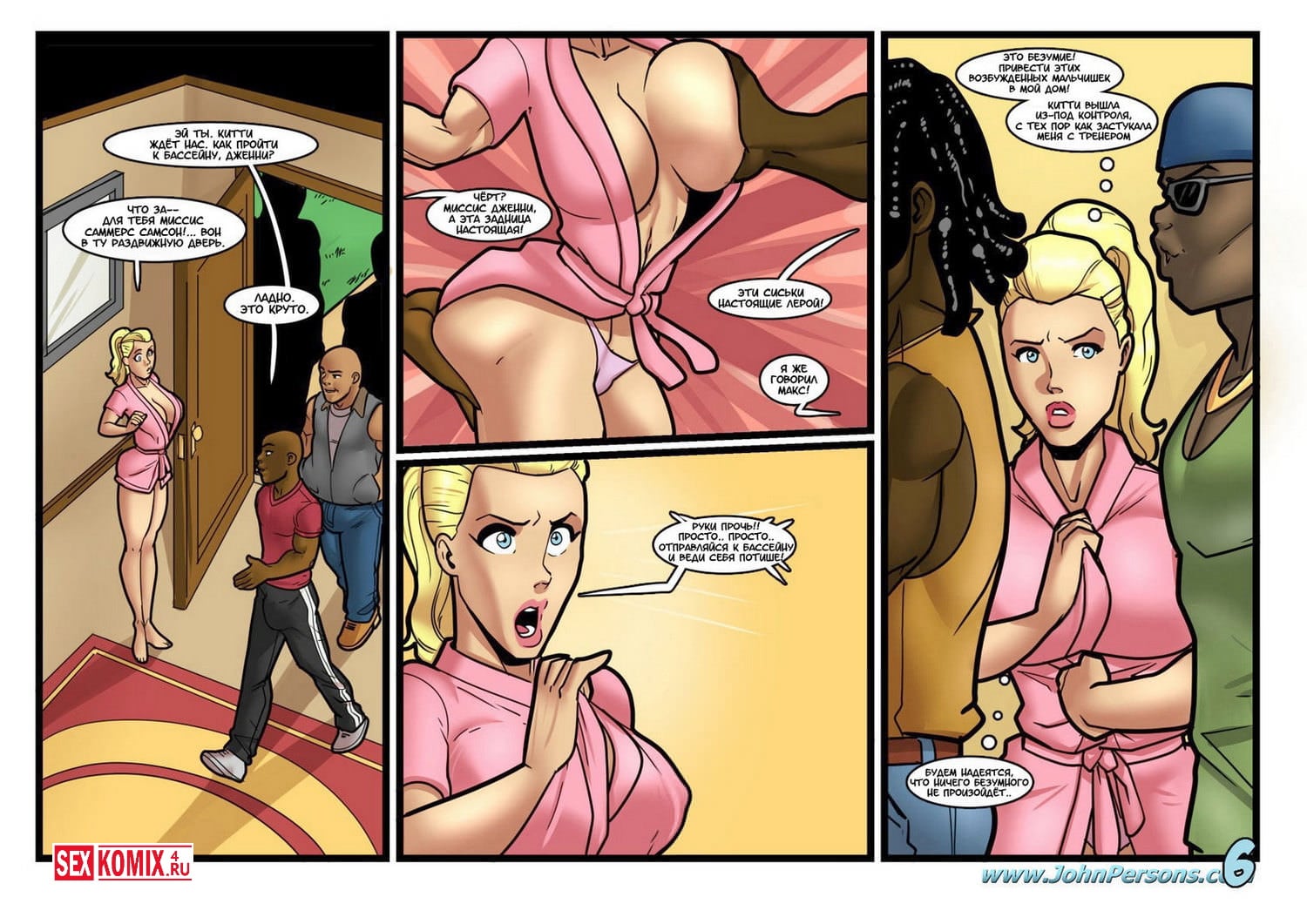 Порно комикс Вечеринка у бассейна. Компания развратных студенток устроили вечеринку у бассейна в доме одной из девушек. Они пригласили на вечеринку парней из футбольной команды. Почти все парни чернокожие и славятся в университете своими огромными членами. Девчонки подобрали для себя пару и все вместе они пошли купать в бассейне. Подростки брызгались и весело проводили время в воде, но основная цель этой вечеринки это опробовать на своих сочных пизденках, огромные члены спортсменов. Каждая красотка отвела своего избранника в отдельную комнаты и предложили секс, парни не из тех отказывает девушкам. Они устроили красоткам отличную порку.