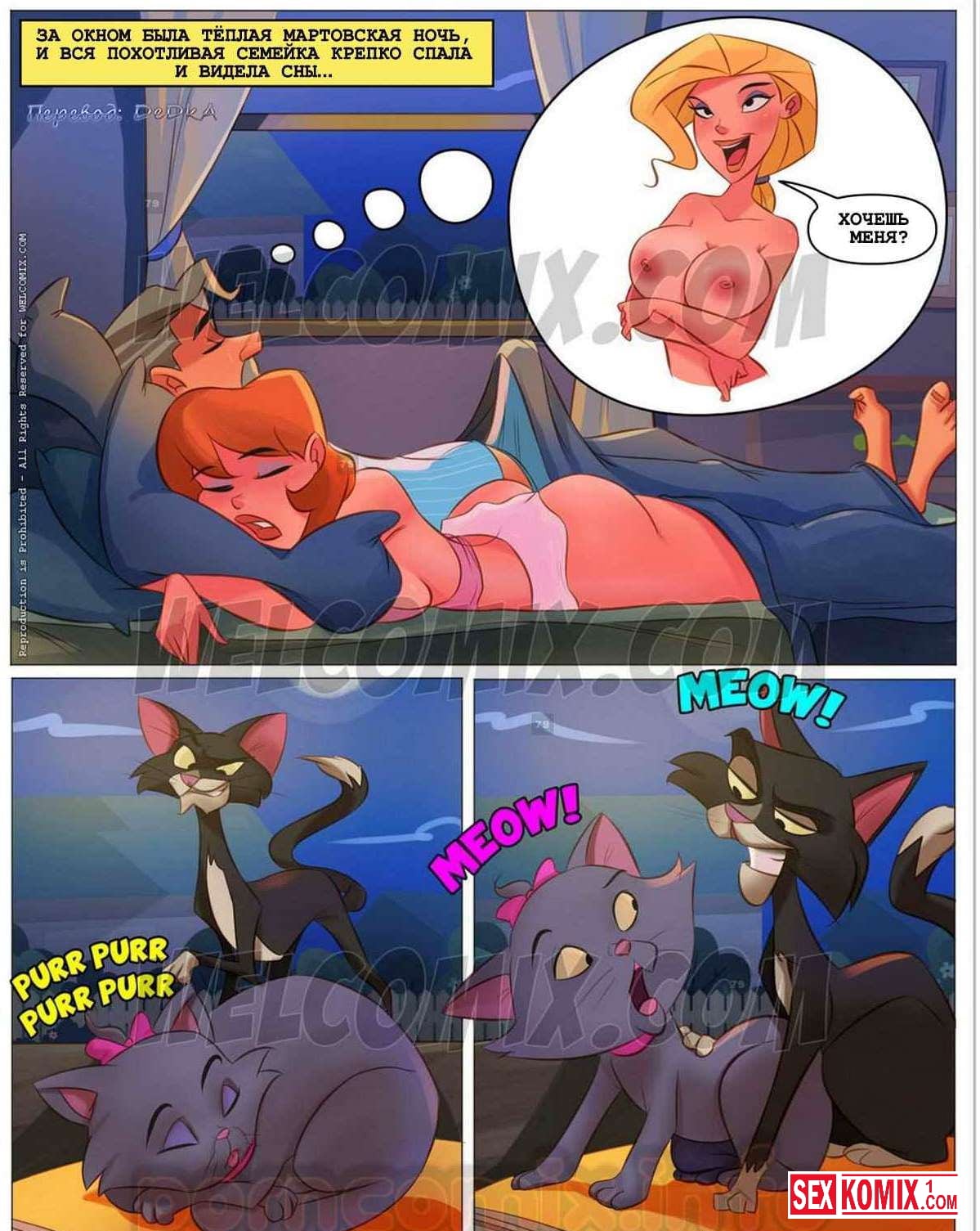 Порно комиксы «Похотливая семейка. Часть 27. Страстная кошечка». Этот секс комикс о там, как отец семейства, проснулся от крика мартовских котов. И не мог долго заснуть, начал ходить по дому от безделья. Зашёл в комнату к дочери, она была совсем раскрыта и он возбудил от молодого соблазнительного тела.