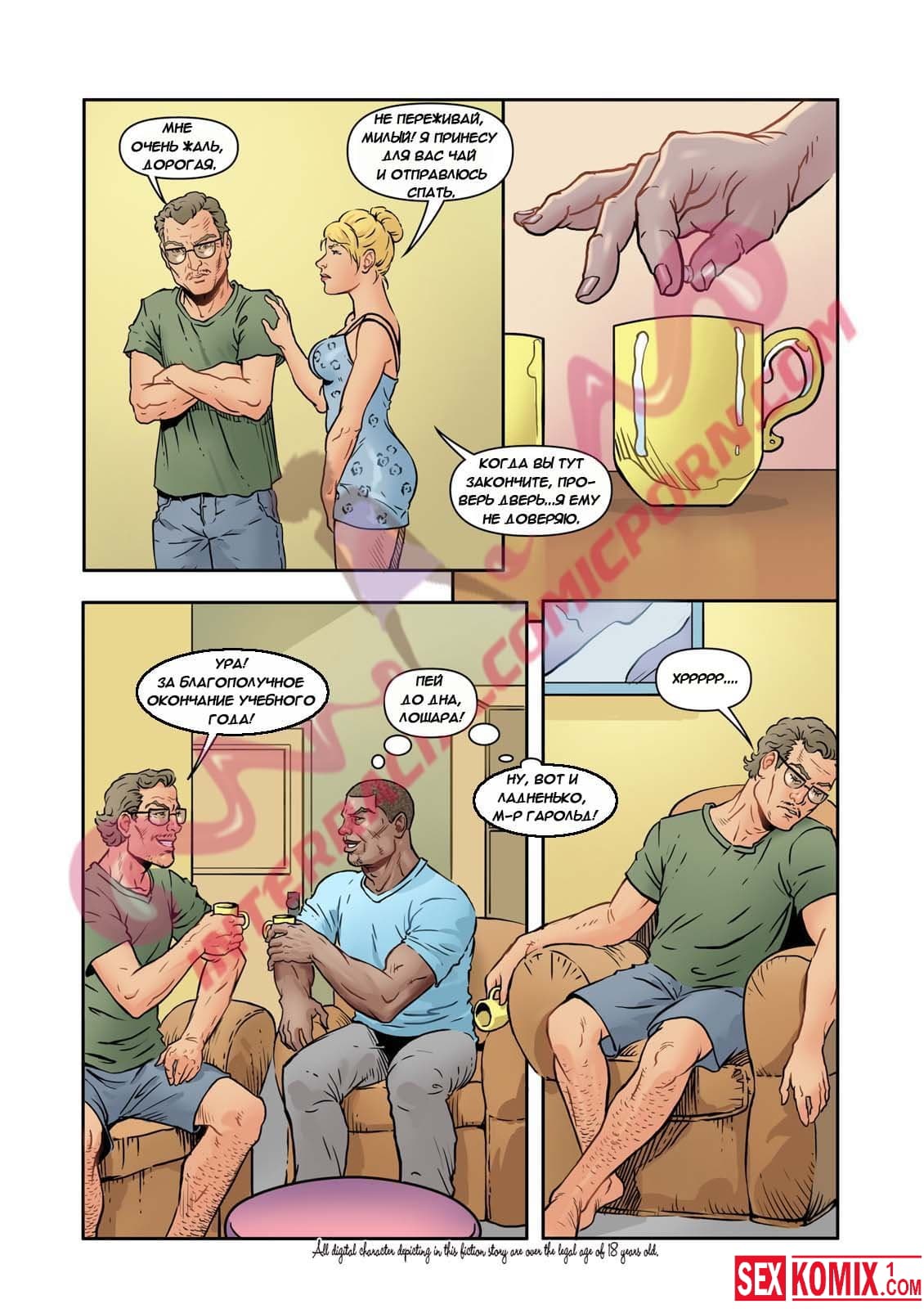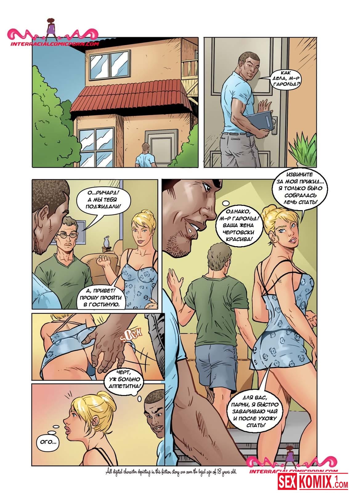 Порно комикс Друг мужа. Чернокожий мужчина приехал в гости к своему старому другу. Они много лет не виделись и решили отметить встречу. Выпив приличное количество алкоголя, хозяин дома уснул. Друг донес его до кровати и уложил спать, на обратно пути он наткнулся на ванну где была сексуальная жена его старого друга. Женщина уже вся текла от желания трахнуть его, она весь вечер мечтала о его члене.