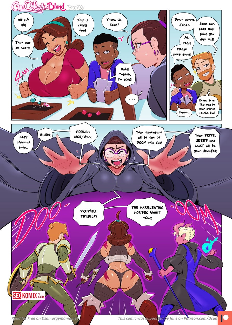 (Обновлен) Порно комикс Кубок любви. Смешение. На Английском. Горячая брюнетка играет со своими друзьями в настольную игру, по сюжету этой игры её персонаж попадает в передрягу с фантастическими существами. И красотка решает проблему с помощью секса, она трахается с ними и парни её отпускают.