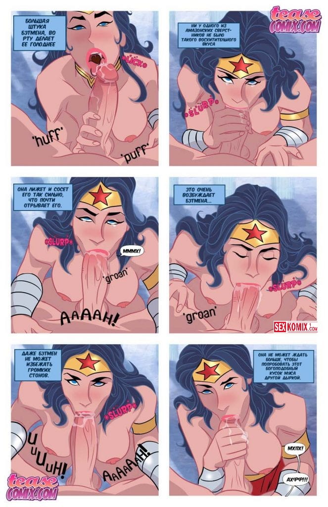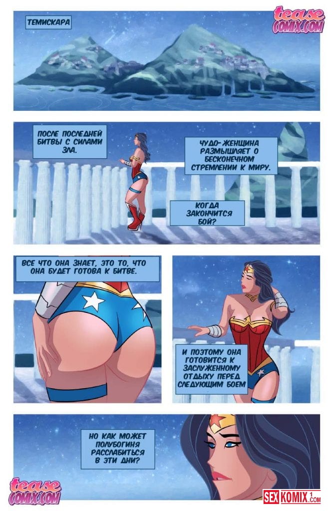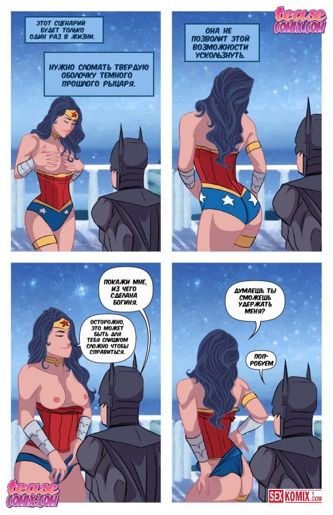 Порно комикс Мне нужен Бэтмен. Чудо женщина после долгих битв против зла отдыхает и мечтает о мире во всем мире. Они пытается расслабиться и начинает мастурбировать. Женщина представляет единственного мужчину которого она любит и может доверять только ему. Это Бетмен, он является в её фантазии и они занимаются страстным сексом.