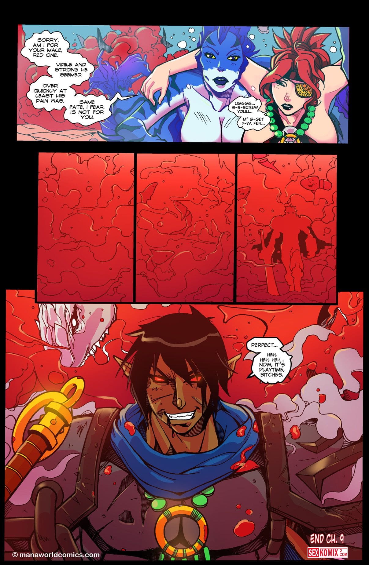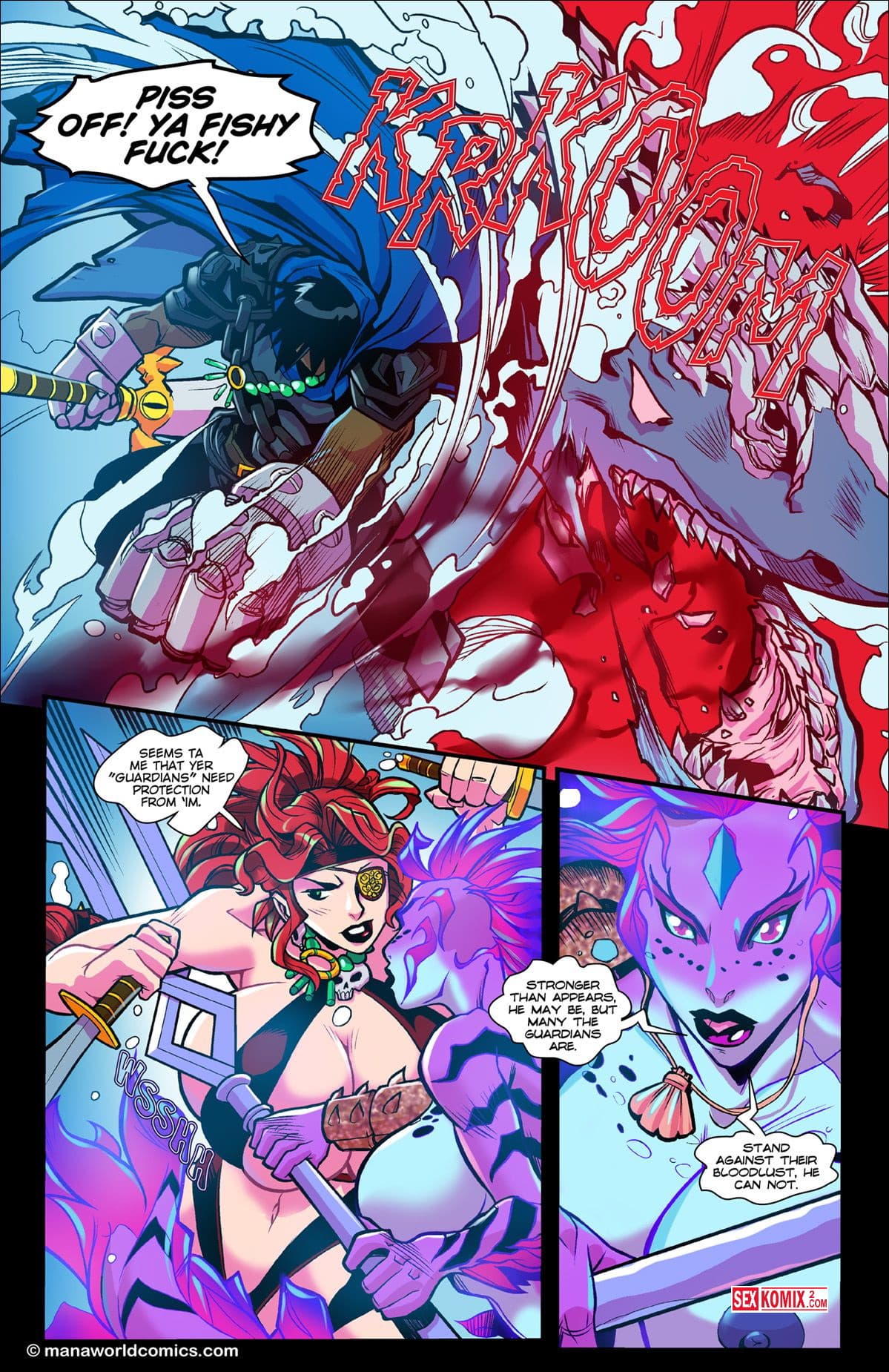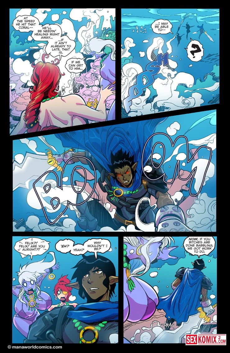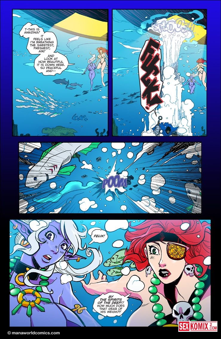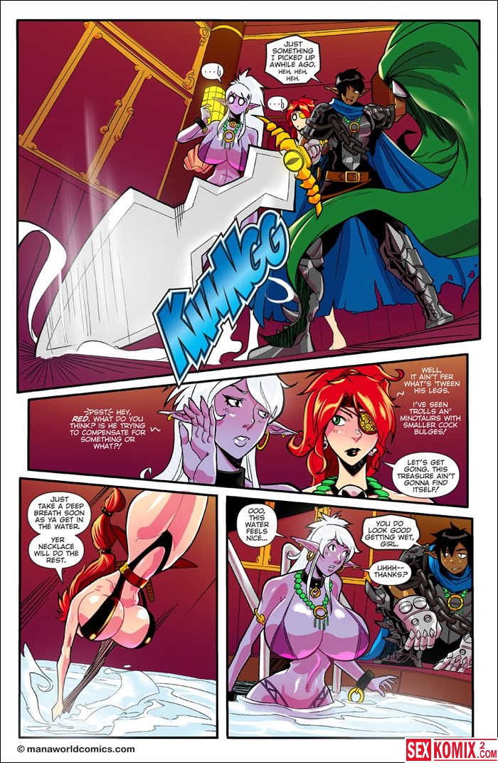 Порно комикс МанаВорлд. Часть 9. Намокнуть. Английский. Грозная женщина капитал с красными волосами и большими сиськами продолжает свои приключения. Вместе со своей подругой светлой эльфийкой они находят подводное царство, но как только девушки туда спускаются их сразу ловит охрана замка.