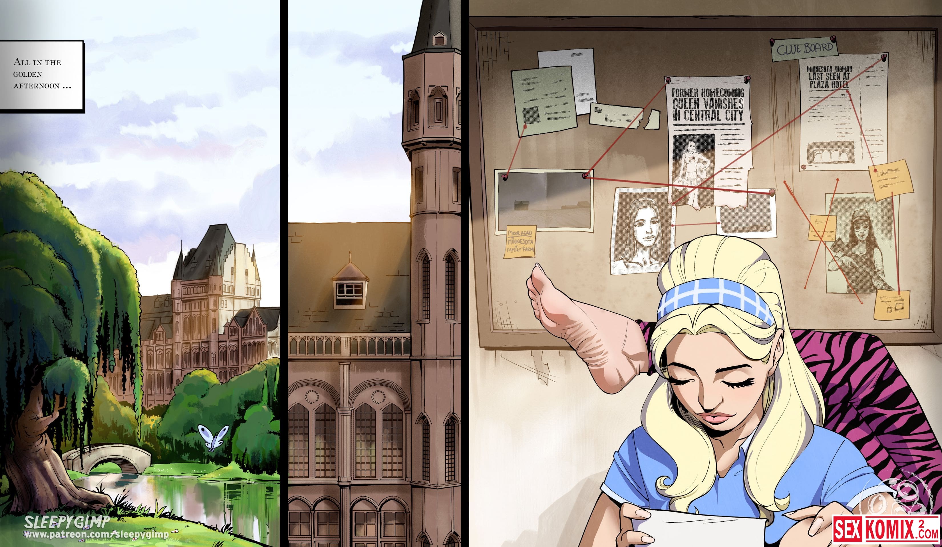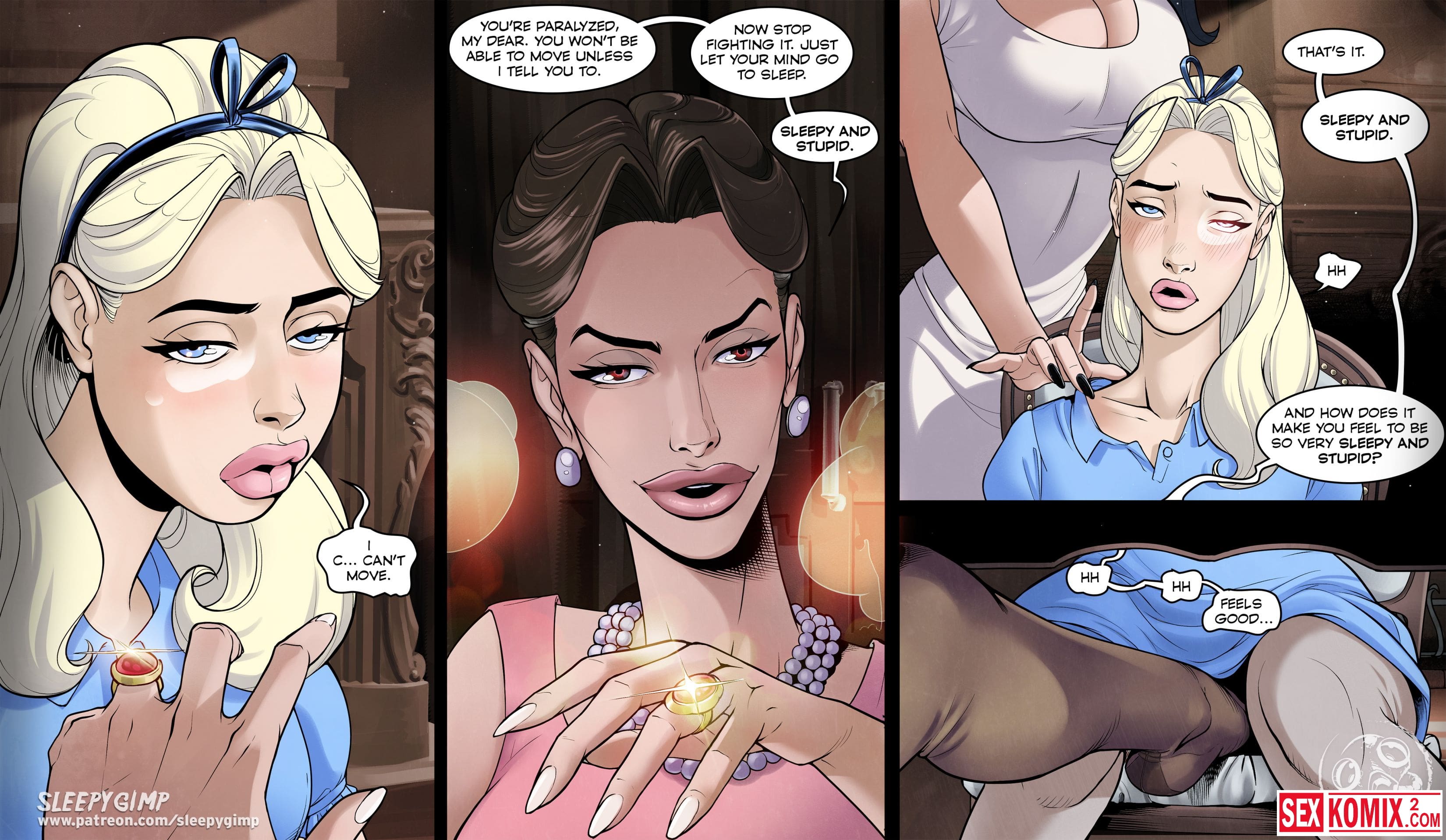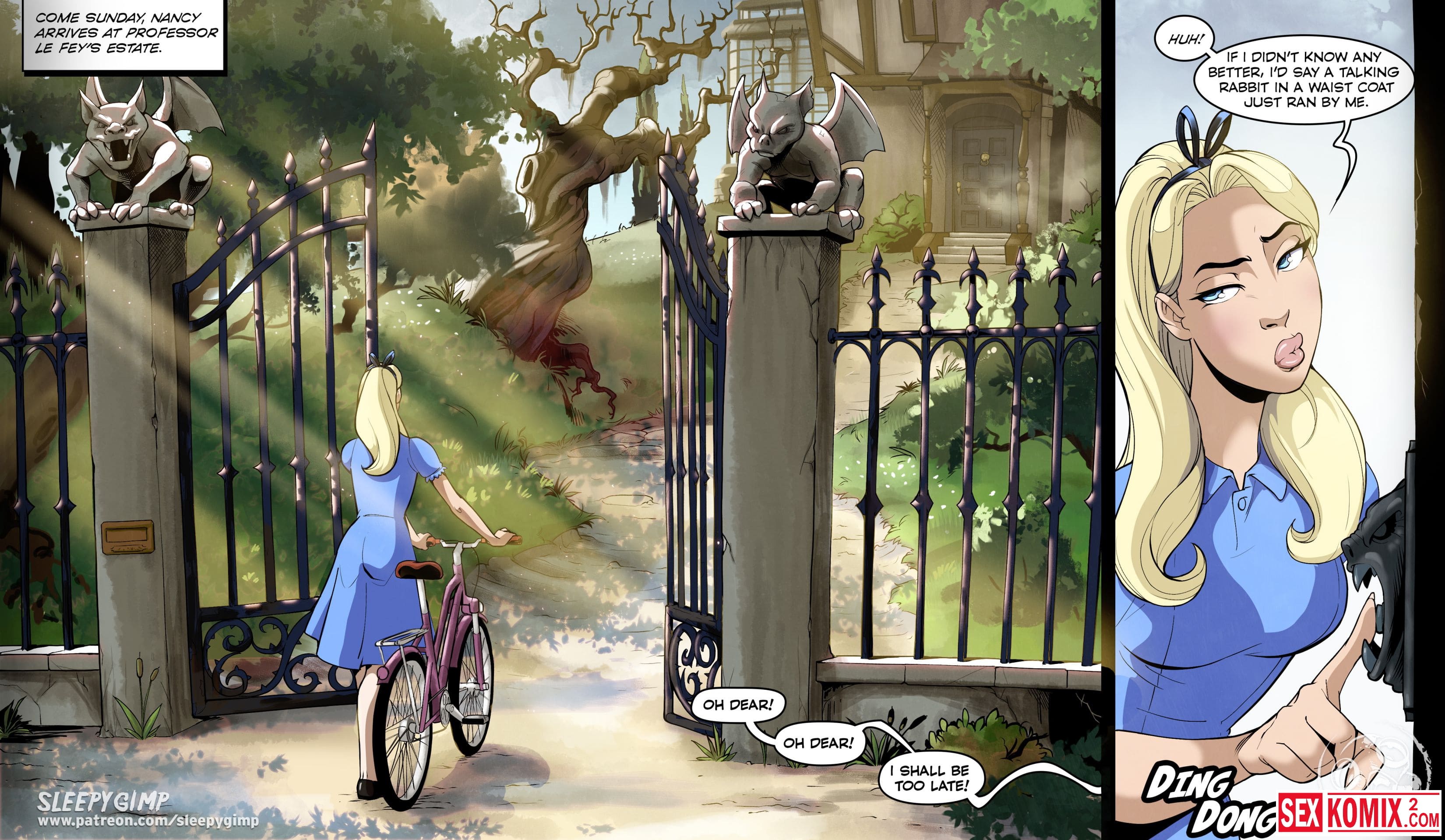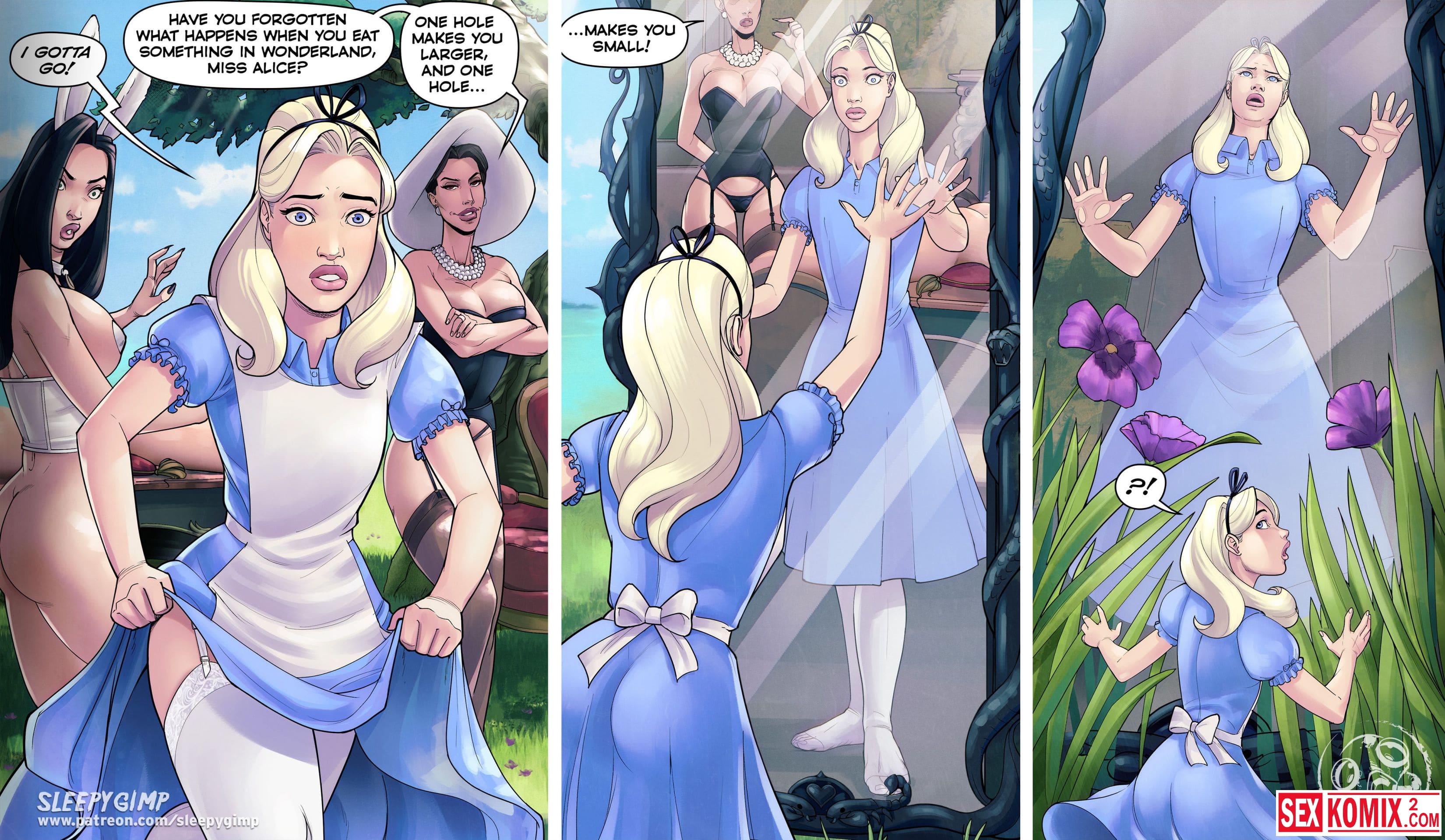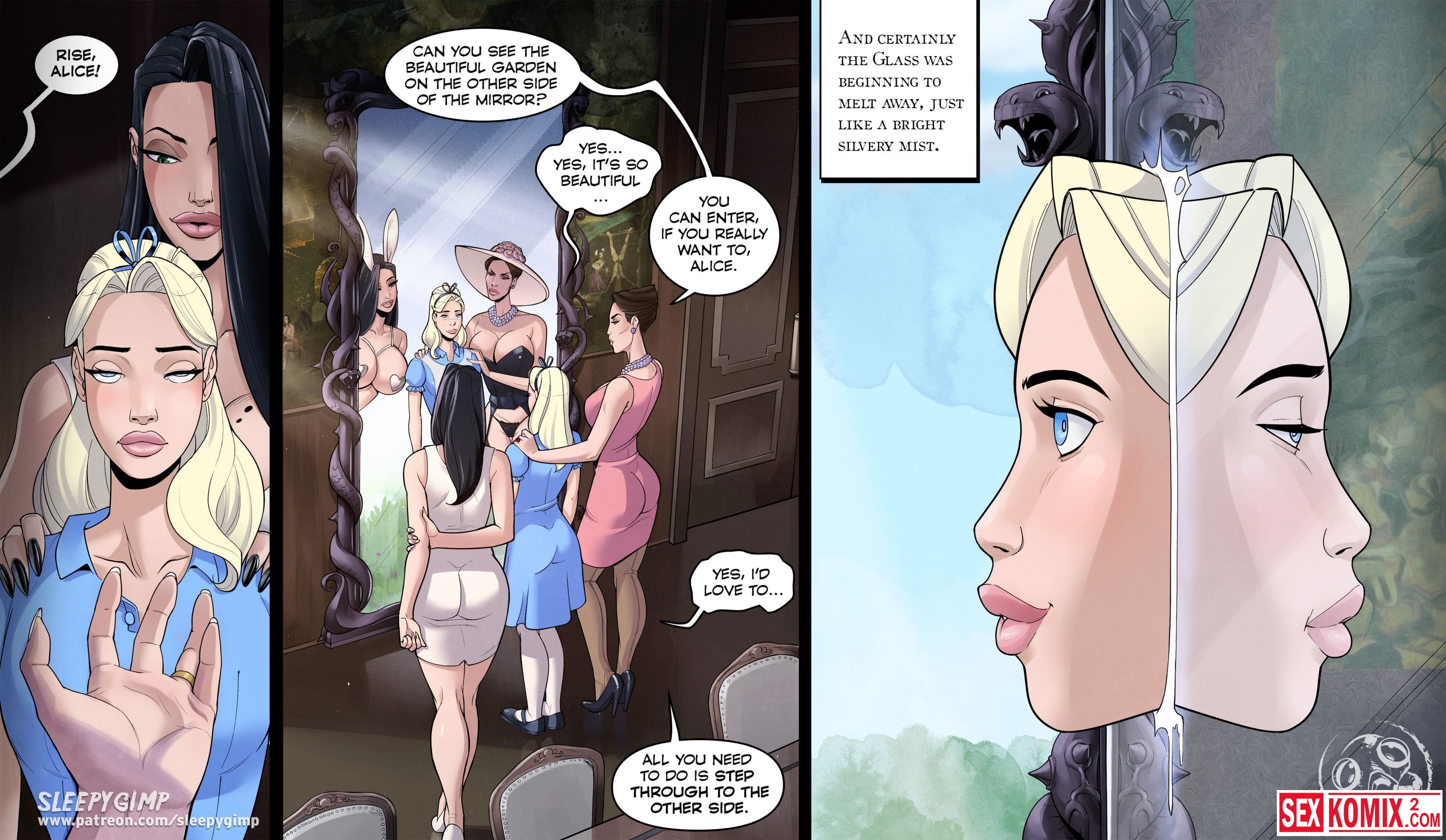 Порно комикс Sleepy Gimp. Зазеркалье. Английский. Аппетитная блондинка получает приглашение в замок на чаепитие, она с радостью туда приходит. Но когда выпивает чай, с ней что-то происходит и она попадает в волшебную страну как Алиса. Но приключения девушки в основном связаны с лесбиянками и БДСМ сексом.