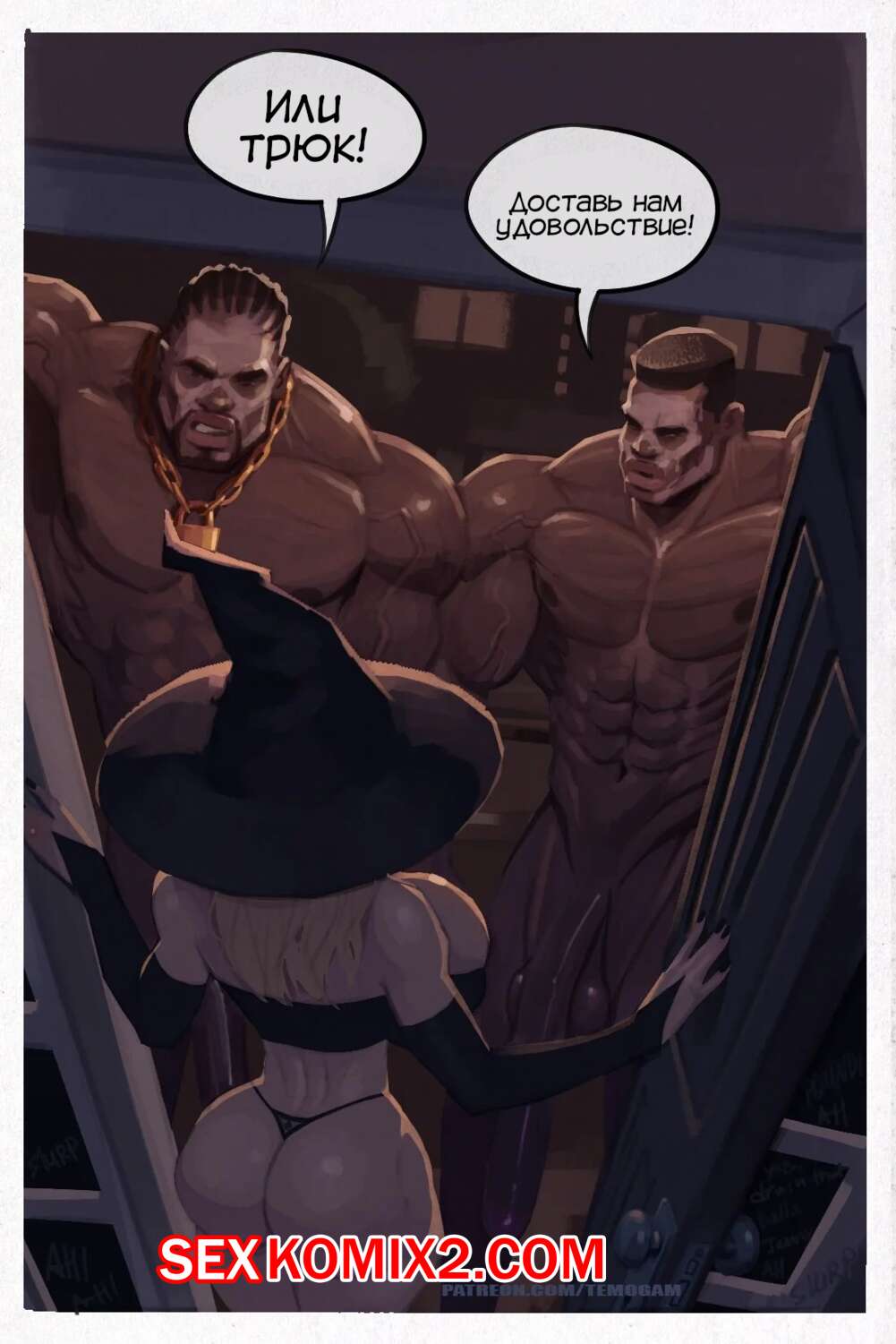 Порно комикс Хэллоуин. Halloween. Temogam Два черных парня с огромными хуями отправились домой к горячей сисястой блондинке милфе, чтобы с ней повеселиться. Сучка разделась и стала у них отсасывать, после чего дала им себя выебать в обе дырочки.