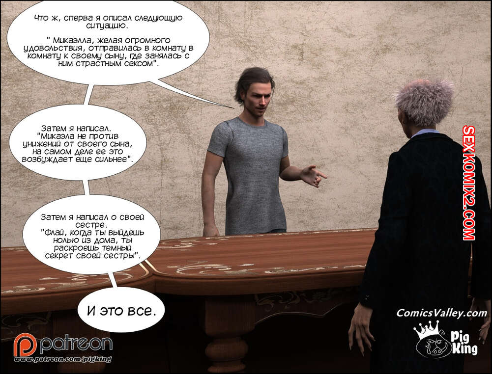 Порно комикс Адская деревня. Микаэла. Часть 4. Hell village. Micaela. Pig King Парень шантажом заставил свою сестру заняться с ним сексом. В этот момент он рассказал, что также ебет свою маму милфу, но сестра не поверила. Поэтому парень решил все ей доказать.