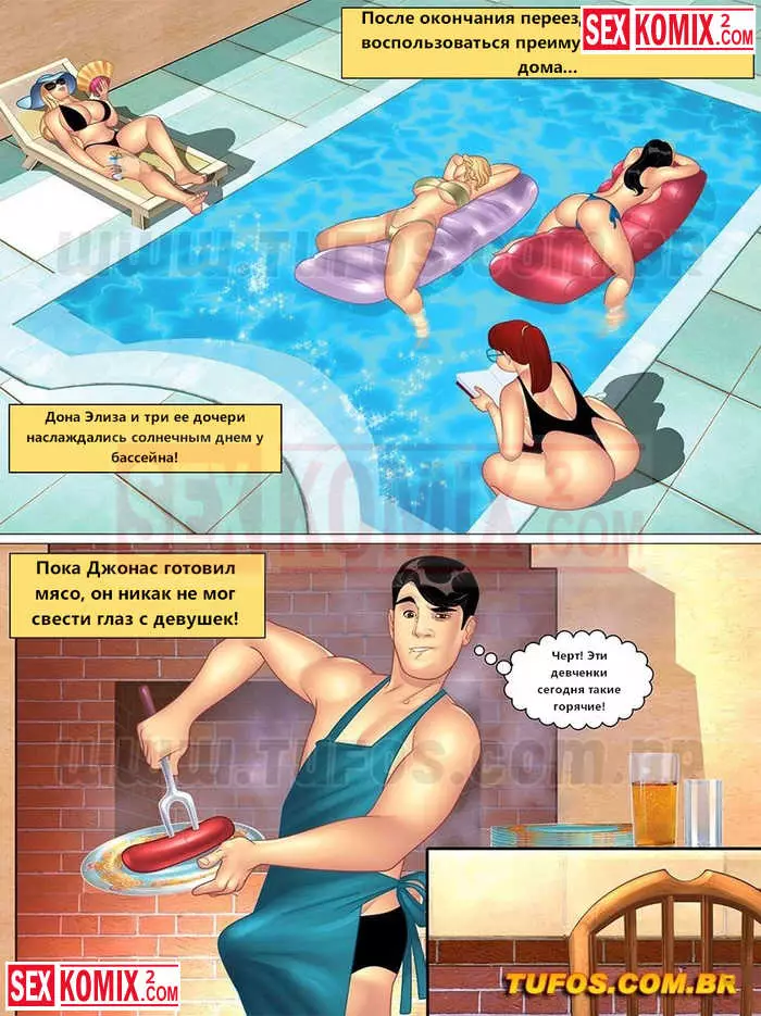 Порно комикс Тетя, кузины и племянник. Часть 3. Барбекю. Парень жарил сардельки на гриле и предложил попробовать оду своей горячей тетушке, женщина откусила кусочек от сардельки и возбудилась, представляя член парня.