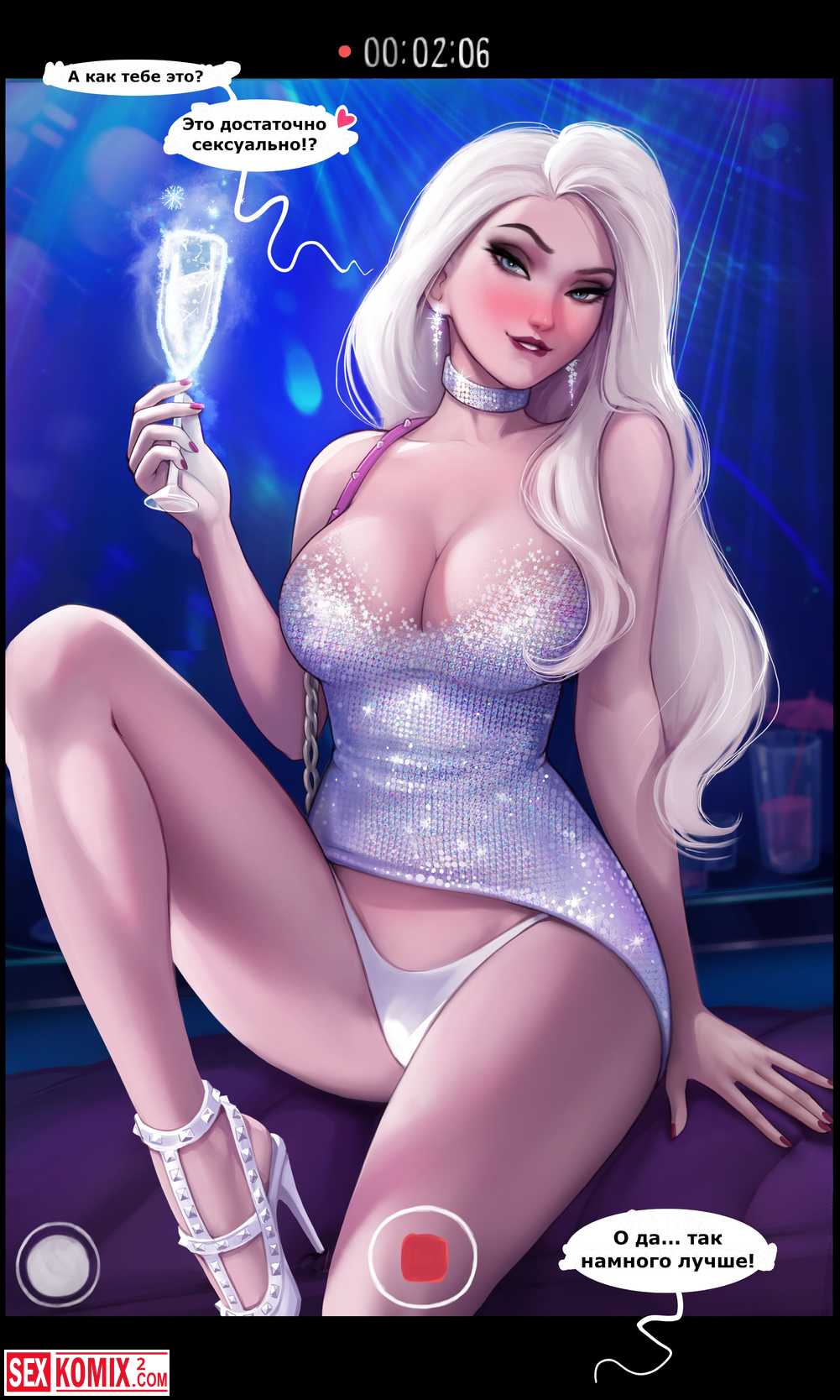 Порно комикс Вечеринка у Эльзы. Горячая блондинка, точнее холодная, так как она снежная королева. Раздвигает свои длинные ноги впускает в киску член парня.