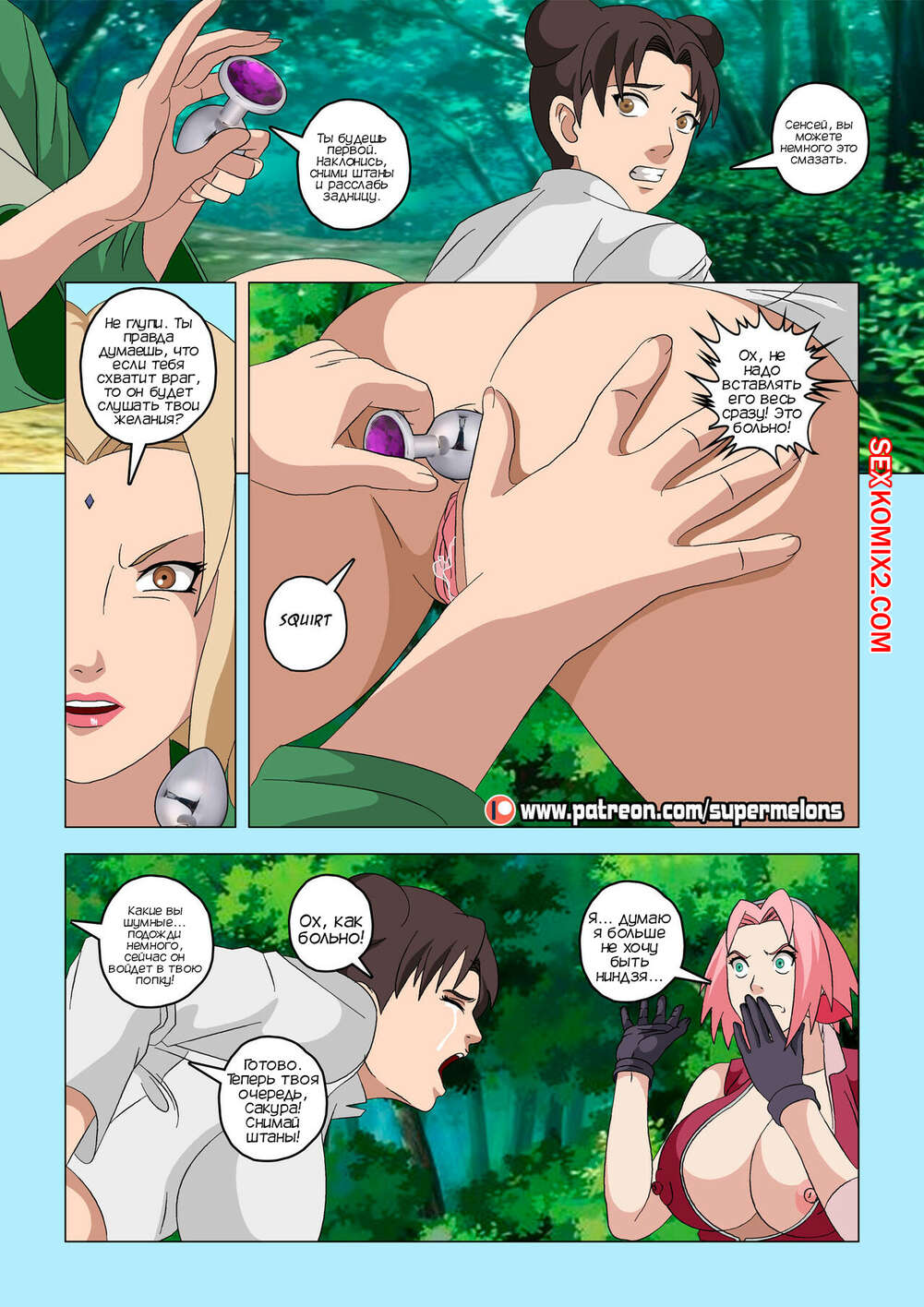 Порно комикс Наруто. Смертельная тренировка. Deadly Training. Super Melons Красотка Сакура отправилась на персональную тренировку с Тсунаде, но прийдя на место, она не нашла ее. Оказалось, что блондинка милфа уединилась в кустах с брюнеточкой, чтобы заняться с ней лесбийской еблей.