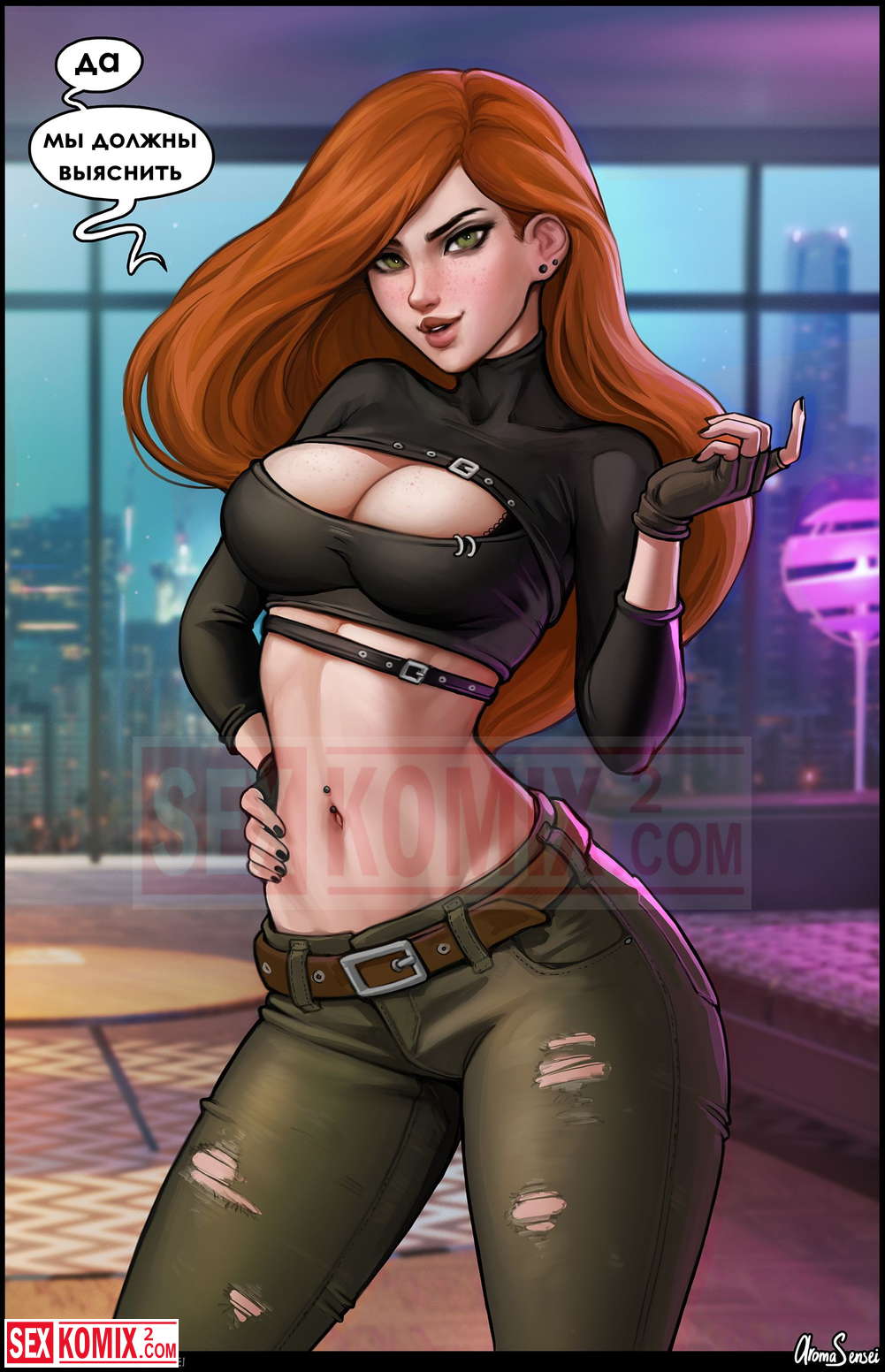 Порно комикс Сюрприз для Ким. Две развратные красотки рыжеволосая и брюнетка с большими сиськами связали парня, сделали ему минет в два ротика.