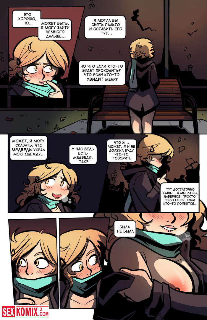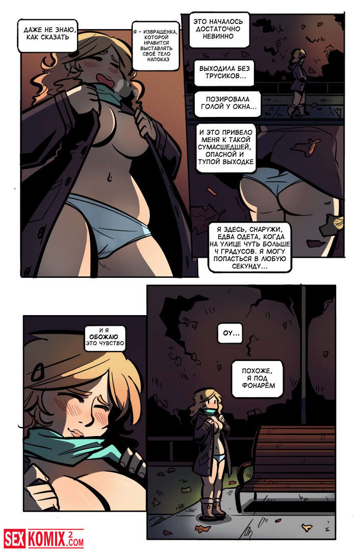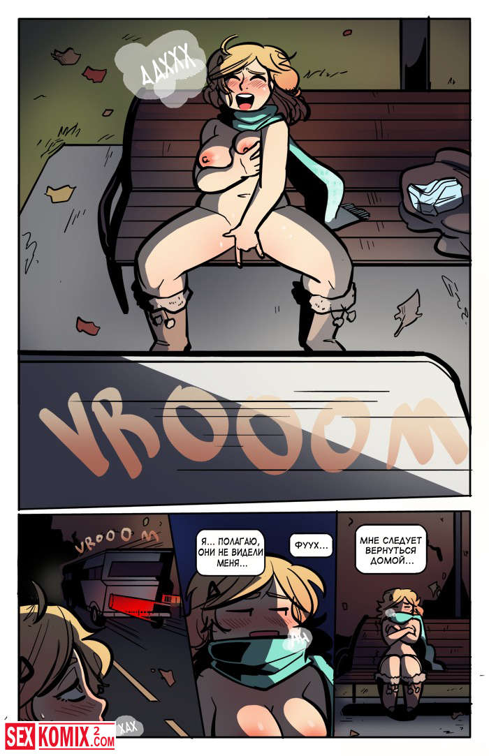 Порно комикс Ночная Прогулка. Симпатичная девушка одела длинный плащ на голое тело и отправилась в парк, она устроилась на лавочке и начала мастурбировать на свежем воздухе.