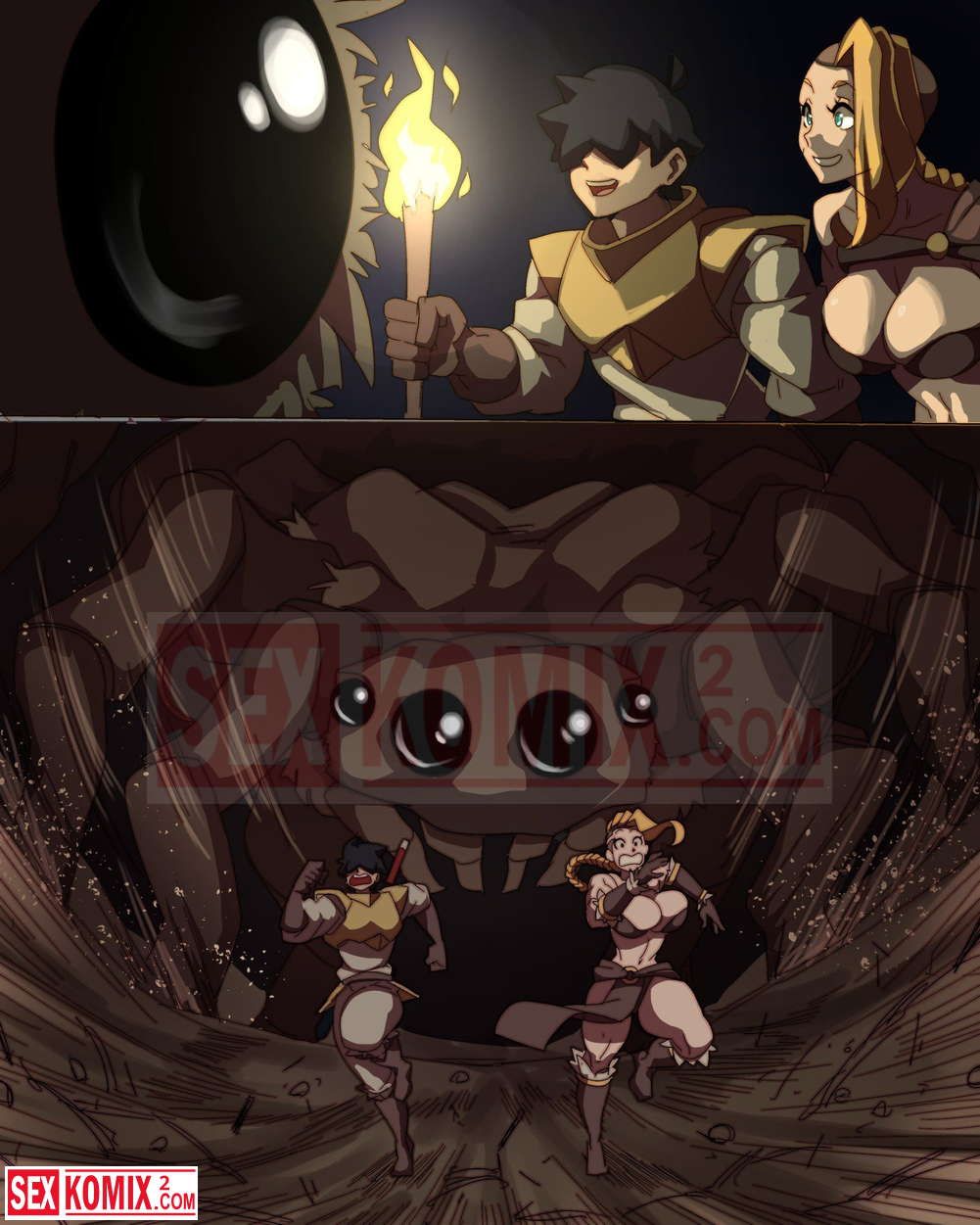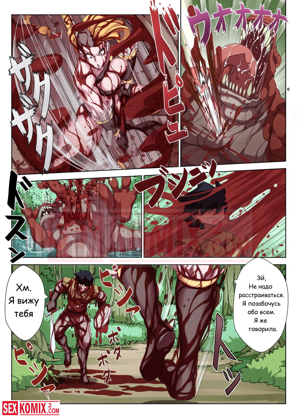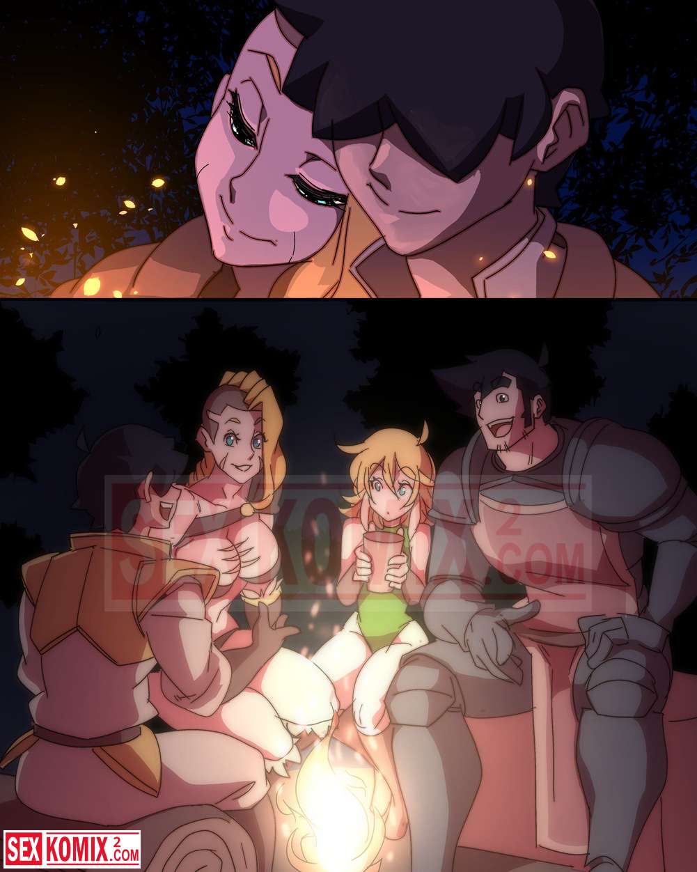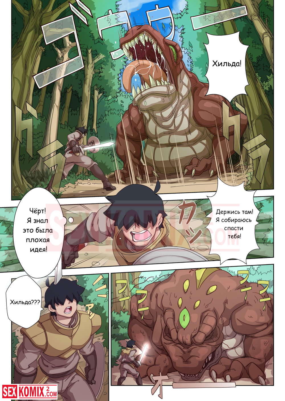 Порно комикс Охота с Хильдой. Девушка воин со своим напарником сразились с огромным монстром, но после долгой схватки победили. Наступила ночь и пришло время для развлечений.