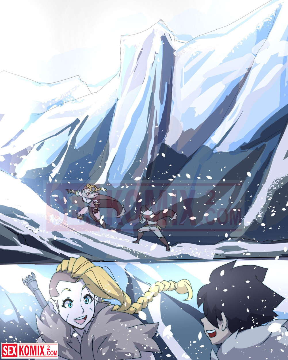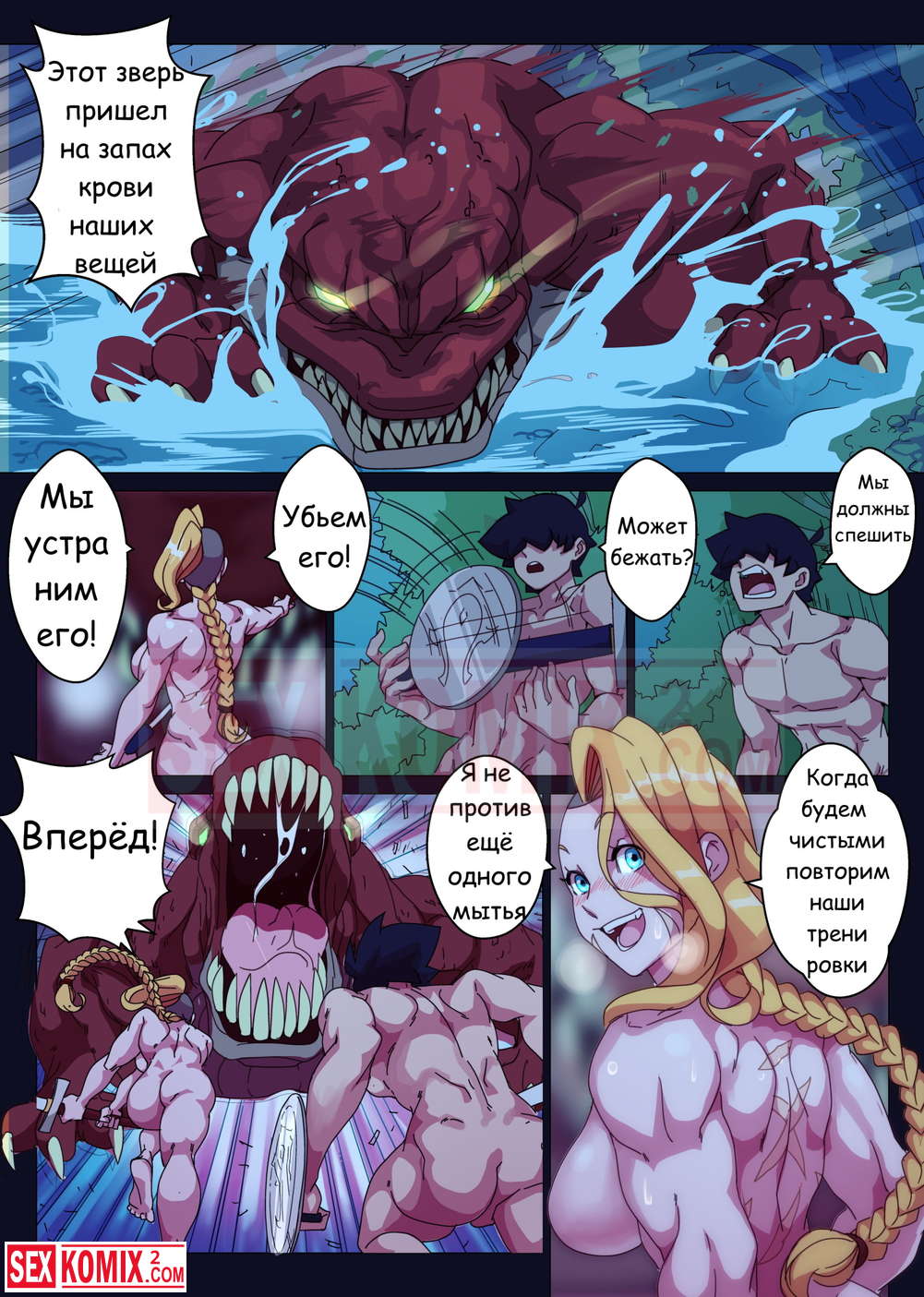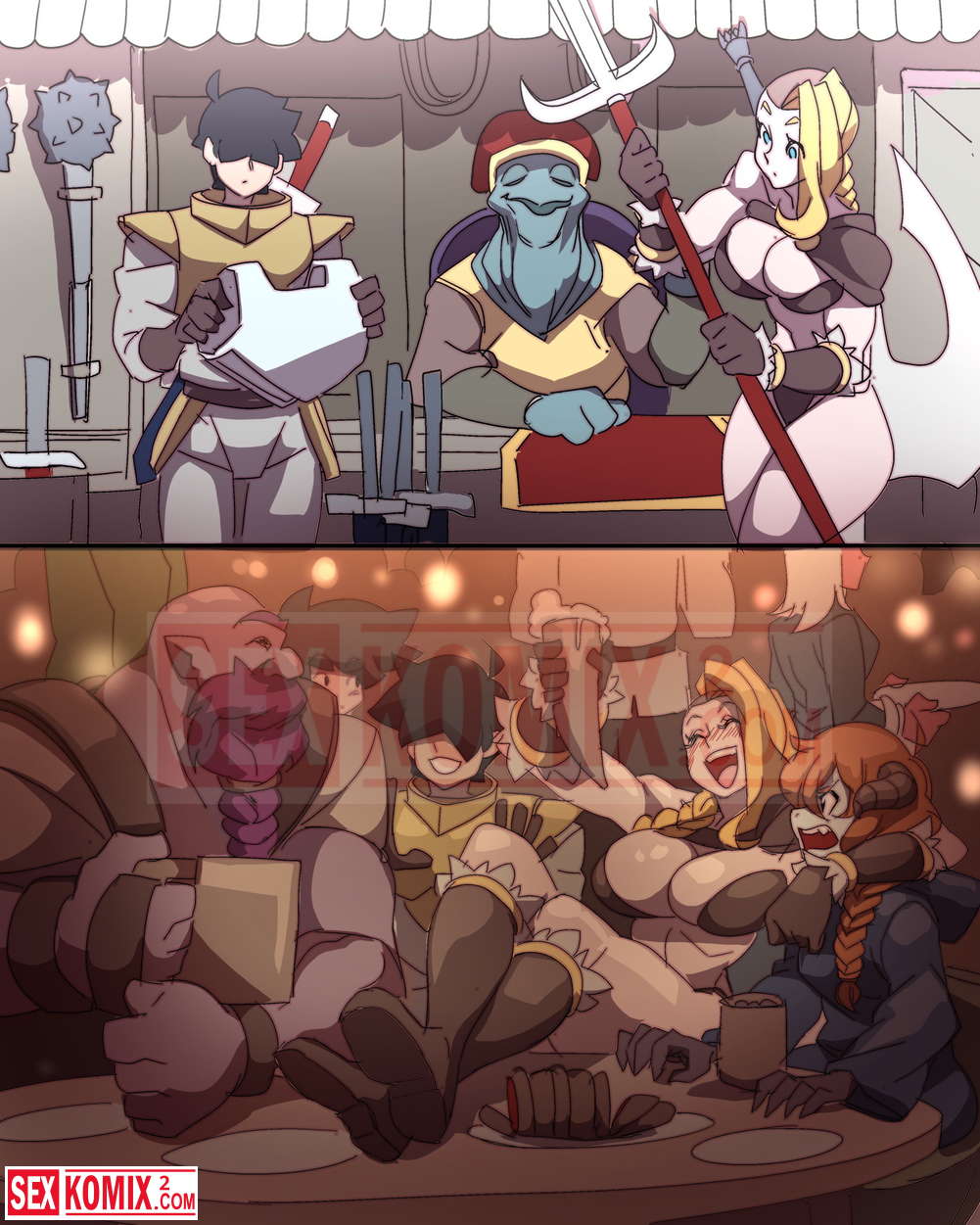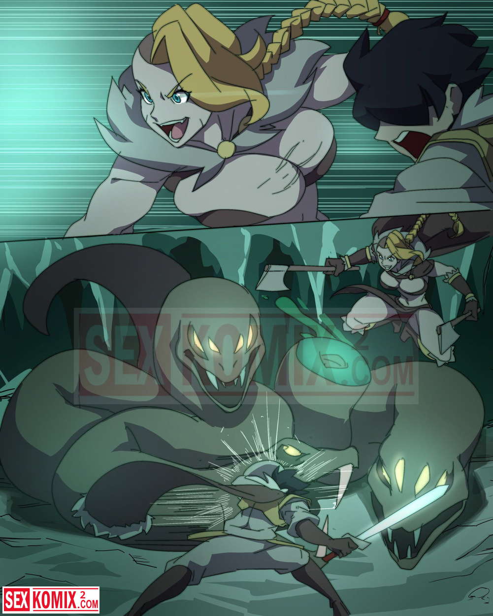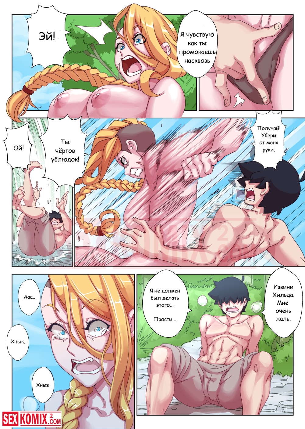Порно комикс Охота с Хильдой. Девушка воин со своим напарником сразились с огромным монстром, но после долгой схватки победили. Наступила ночь и пришло время для развлечений.
