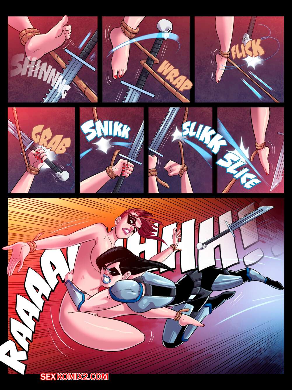 Порно комикс Красный Ангел. Часть 9. Red Angel. JABComix Сексуальную рыжую красотку окружили бандиты и она решила отвлечь их, занявшись с ними сексом. Красотка разделась и возбудила парней, после чего дала им себя выебать.