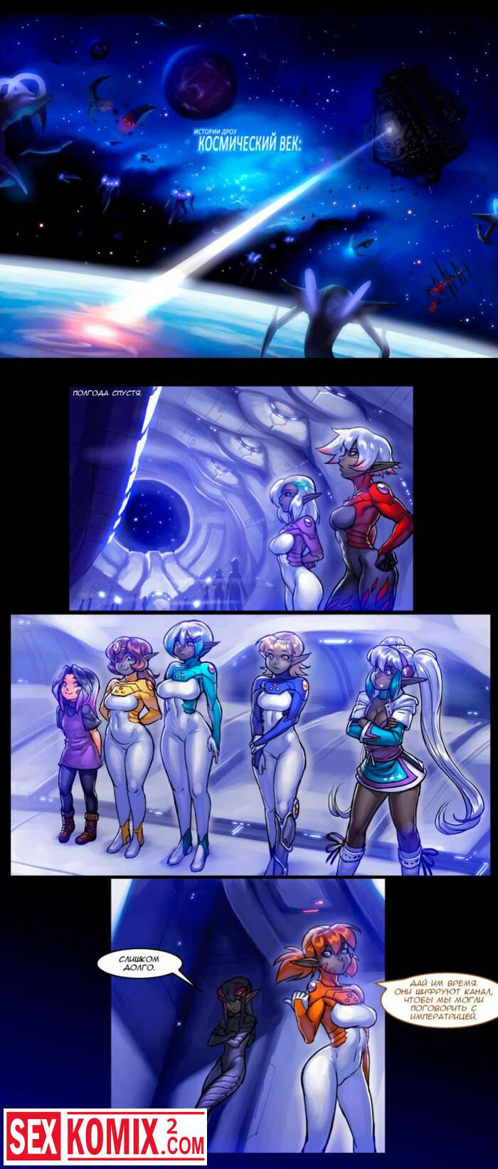 Порно комиксы Истории Дроу. Космический Век. Часть 5. Две сексуальные эльфийки уединились в душе, в перерыве между боями и занялись лесбийским сексом.