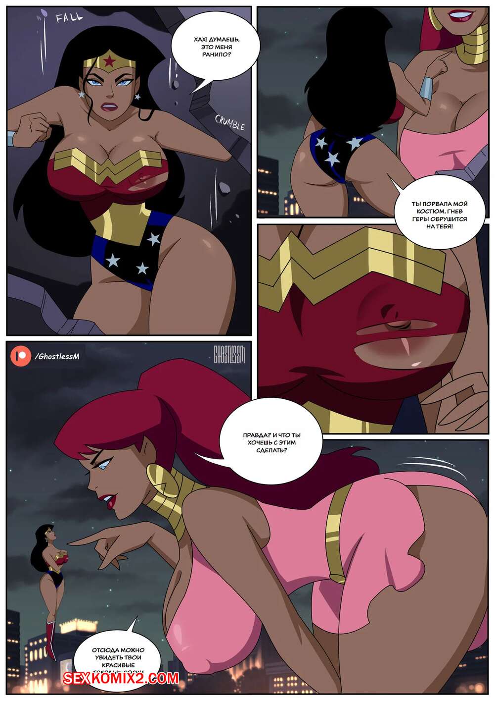 Порно комикс Лига справедливости. Большая проблема. Big Trouble. Ghostlessm Чудо Женщина сражалась с огромной противницей. Ей удалось повалить девушку на землю и она стала ласкать ее пизденку, от чего злодейка вернулась в прежние размеры. Девушки продолжили ласкать друг дружку и занялись страстной лесбийской еблей.