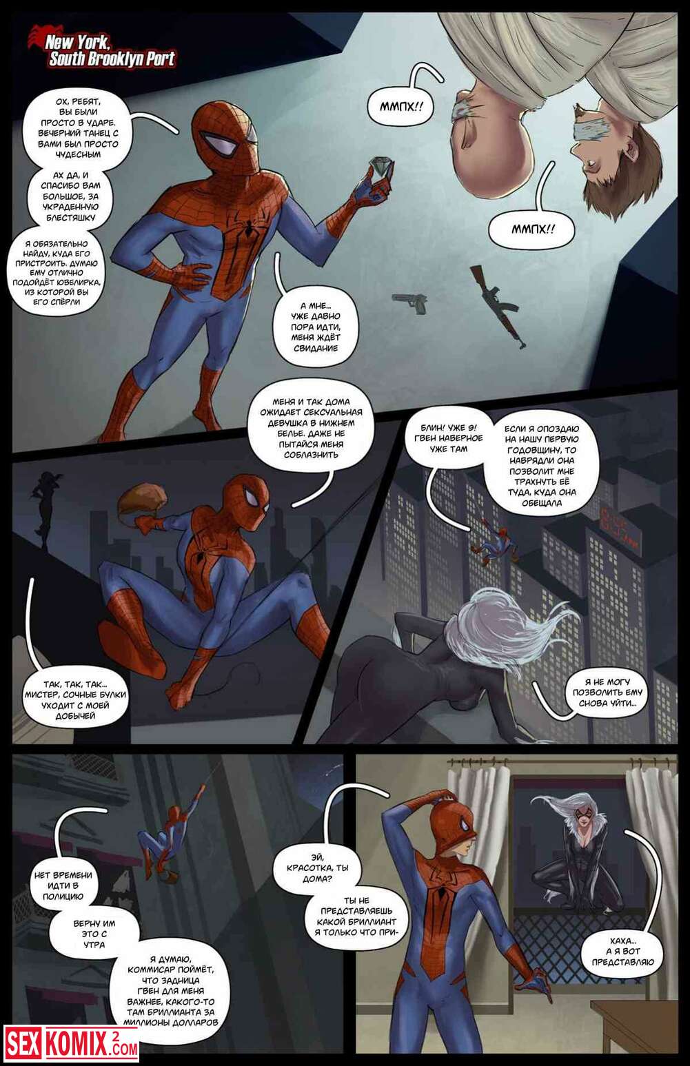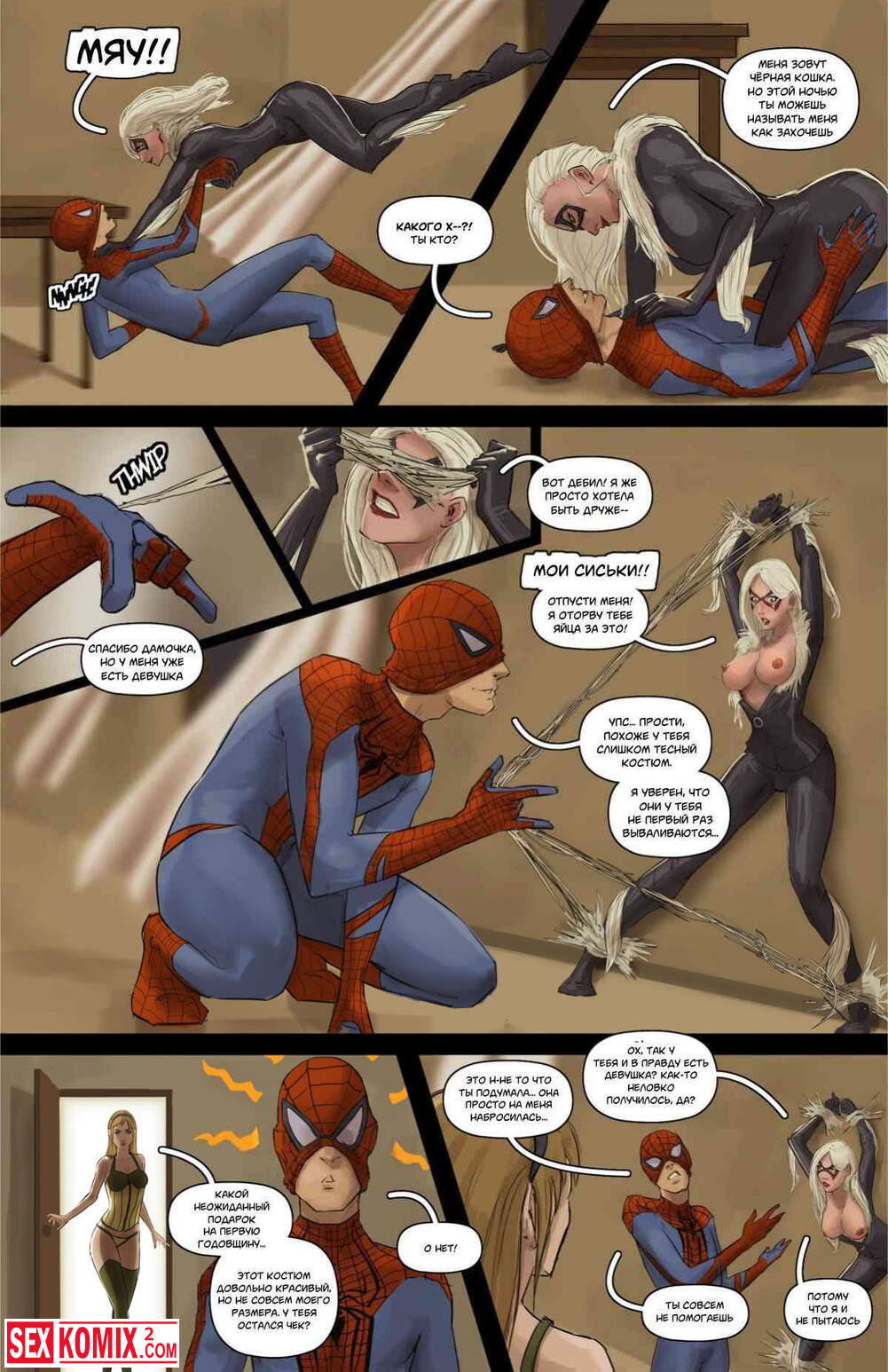Порно комикс Девять оттенков Черной кошки. Кошка проследила за пауком и проникла в его дом, но он схватил её и устроил секс втроем со своей женой.