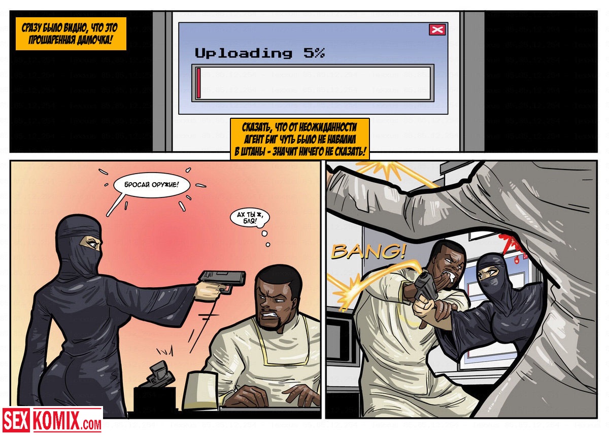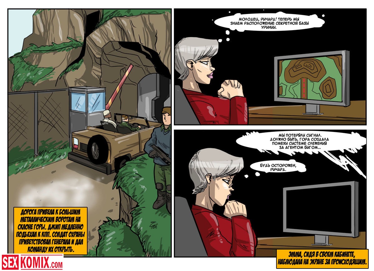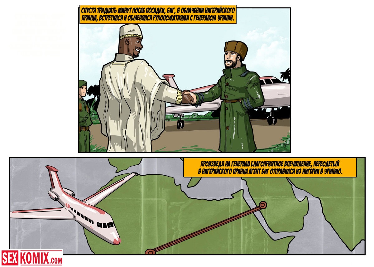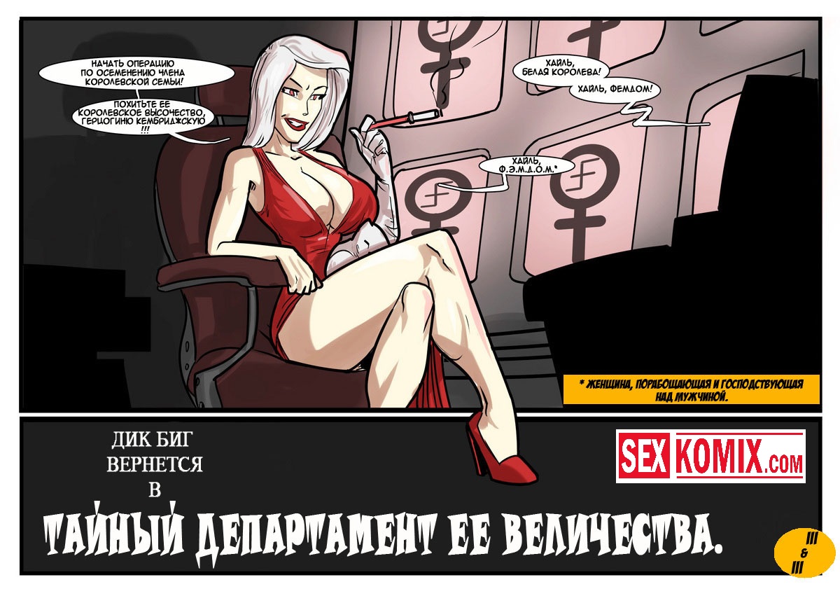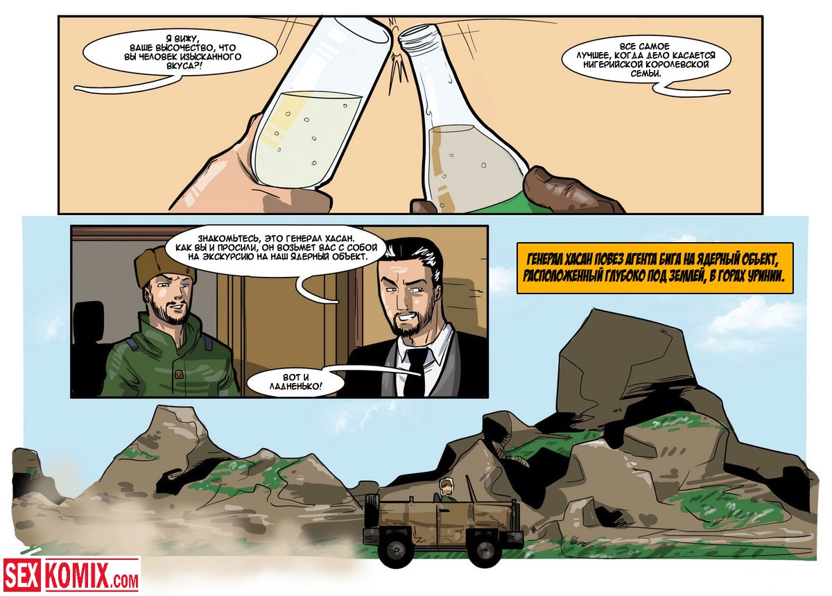 Порно комикс «Дик Бик и лицензия на блуд». В этом секс комиксе вы увидите, супер-агента Дика, он разбирается с любой проблемой и по пути трахает женщин. История начинается с того, что агента вызывает босс, а он в это время трахает свою секретаршу. Закончив с этой грудастой девушкой он идет к начальнику и получает задание закачать компьютерный вирус в системы врага, чтобы обезвредить ядерное оружие. Под легендой «принца» Дик летит в Россию, и в полете ему делает минет стюардесса. Сможет ли выполнить миссию агент, читайте в этом порно комиксе!