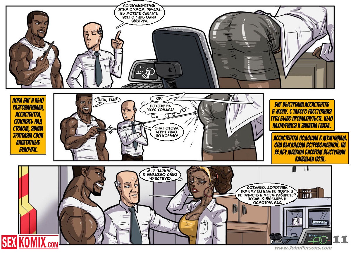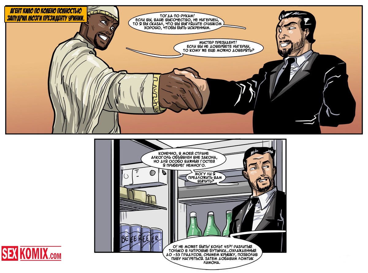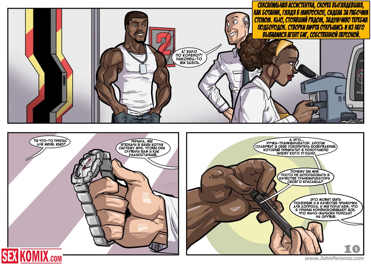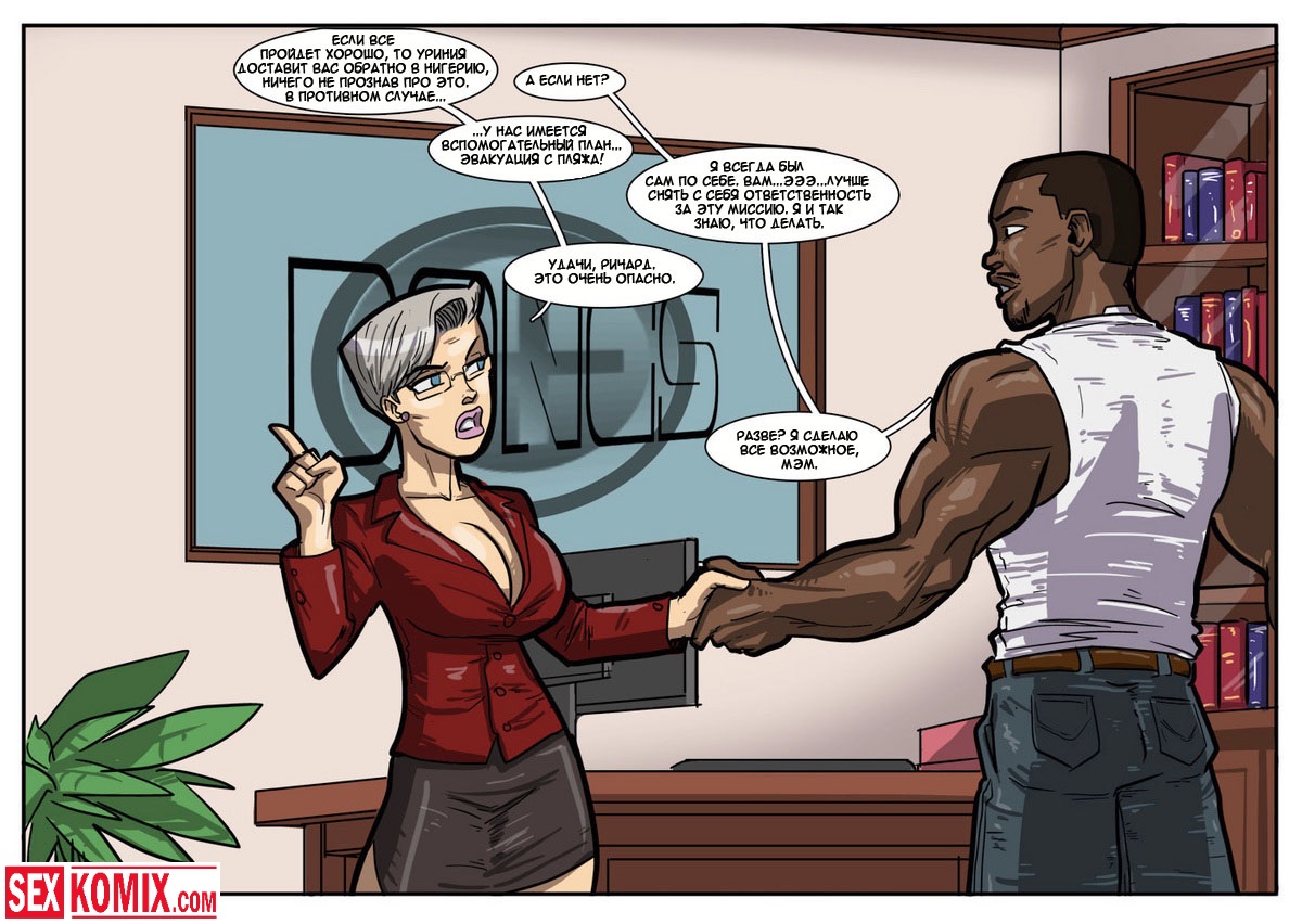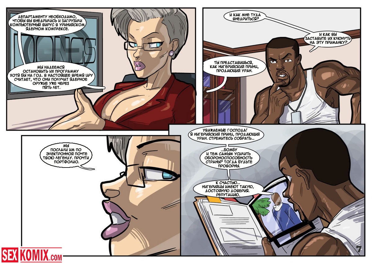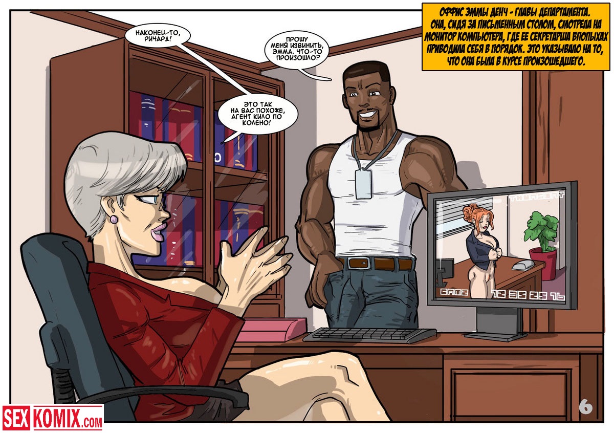 Порно комикс «Дик Бик и лицензия на блуд». В этом секс комиксе вы увидите, супер-агента Дика, он разбирается с любой проблемой и по пути трахает женщин. История начинается с того, что агента вызывает босс, а он в это время трахает свою секретаршу. Закончив с этой грудастой девушкой он идет к начальнику и получает задание закачать компьютерный вирус в системы врага, чтобы обезвредить ядерное оружие. Под легендой «принца» Дик летит в Россию, и в полете ему делает минет стюардесса. Сможет ли выполнить миссию агент, читайте в этом порно комиксе!