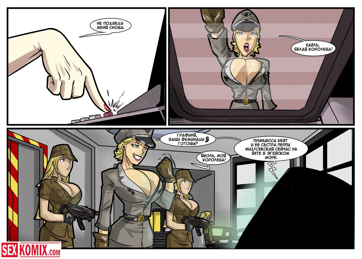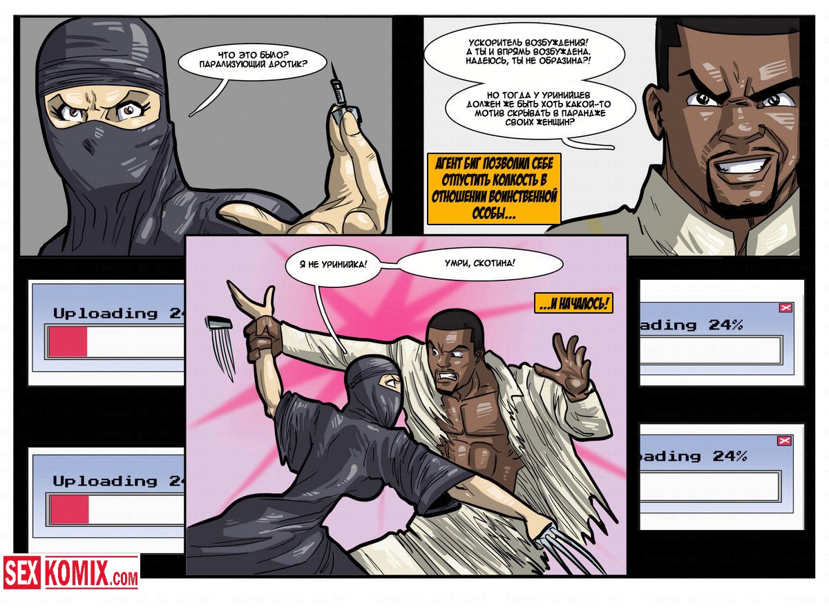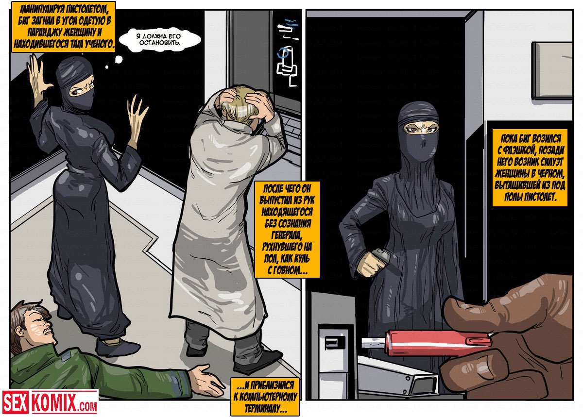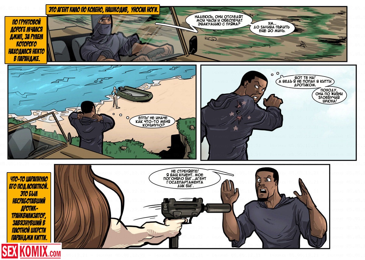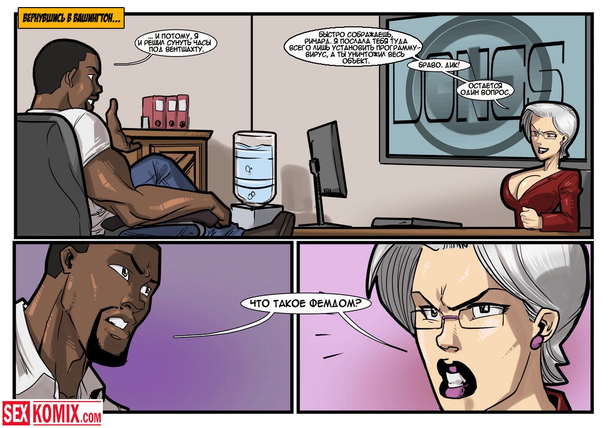 Порно комикс «Дик Бик и лицензия на блуд». В этом секс комиксе вы увидите, супер-агента Дика, он разбирается с любой проблемой и по пути трахает женщин. История начинается с того, что агента вызывает босс, а он в это время трахает свою секретаршу. Закончив с этой грудастой девушкой он идет к начальнику и получает задание закачать компьютерный вирус в системы врага, чтобы обезвредить ядерное оружие. Под легендой «принца» Дик летит в Россию, и в полете ему делает минет стюардесса. Сможет ли выполнить миссию агент, читайте в этом порно комиксе!