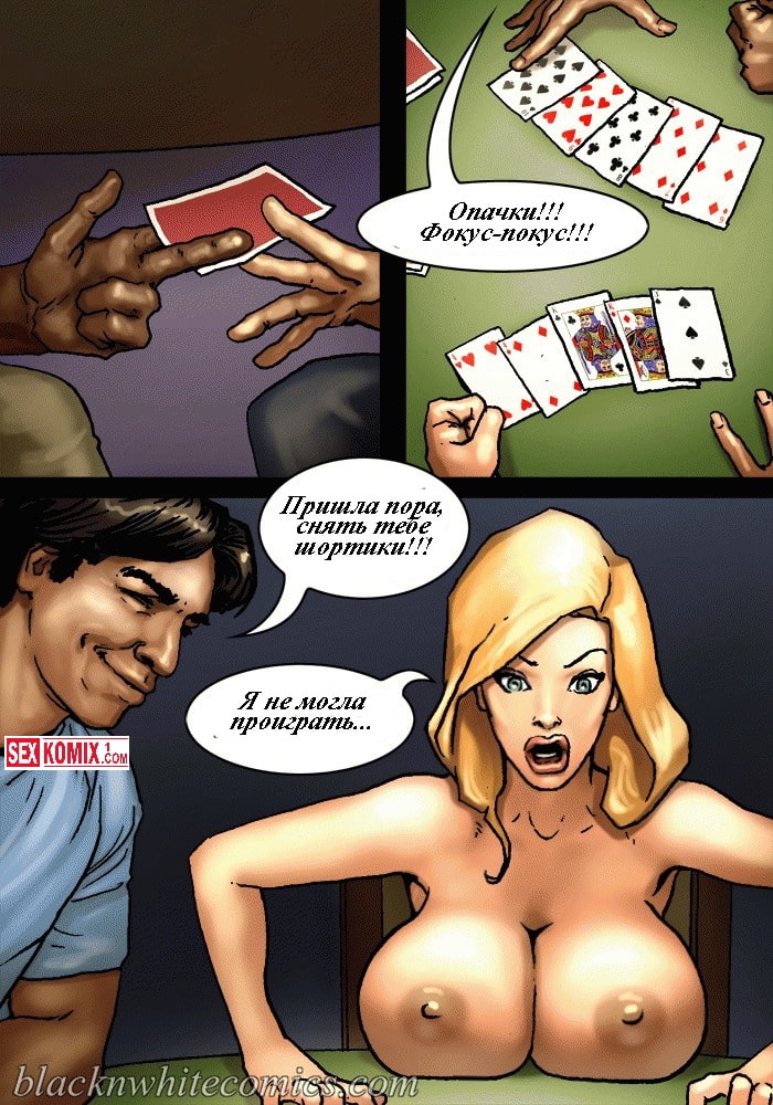 Эрокомикс «Игра в покер». Этот порно комиксы на русском языке о сексуальной блондинке с большими титьками, которая очень любит трахаться и азартные игры. Муж сексуальной девушки проиграл в карты серьёзным людям и они хотели поставить его на счетчик. Но тут вмешалась супруга проигравшего и пообещала отыграться, а мужа отправила погулять на улицу. Но и она постоянно проигрывала, и долг ей пришлось отплатить своим возбуждающим телом, она разделась до гола и предложила игрокам трахнуть её. Парни не обломались и начали засовывать свои большие члены красотке во все дыры. И это по круче денег, секс получался просто невероятный!