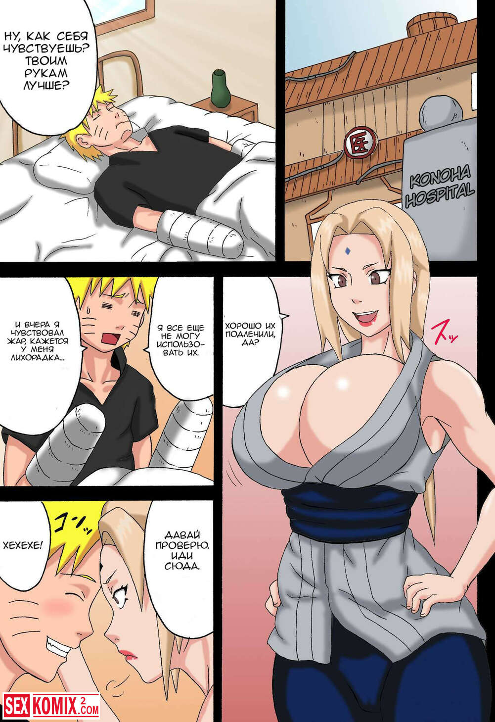 Порно комикс Наруто. Плата сексуального исцеления Конохи. Наруто повредил обе руки и лежит в кровати беспомощны. Цунаде пришла его проверить и увидела крепкий стояк, она решила, что нужно ему помочь и снять напряжение.
