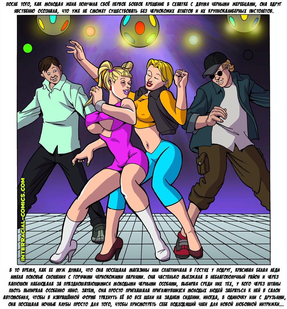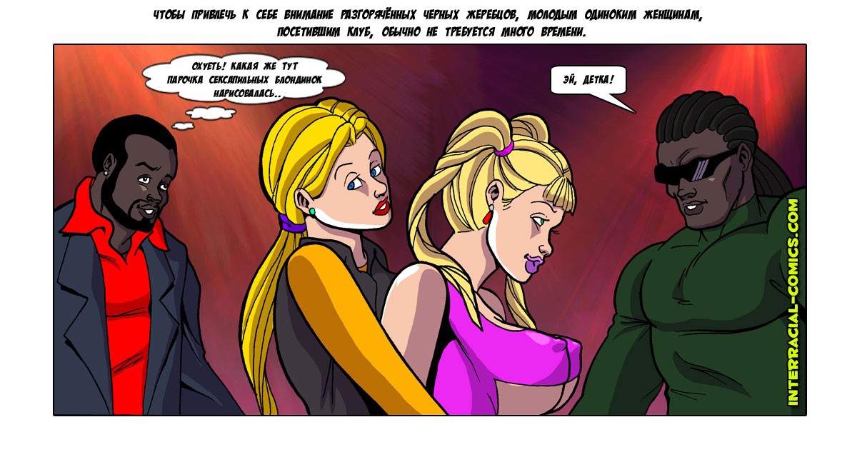 Порно комикс на русском «Жены тоже хотят развлекаться. Часть 2». Эротический комикс о двух сексуальных блондинках, они оставили своих мужей дома и пошли в ночной клуб развлекаться. Как только две красотки вышли на танцпол их сразу же заметили чернокожие братки и подкатили к ним свои большие члены. Дамочки уже соскучились по хорошему сексу и с огромным удовольствием познакомились с парнями. После дискотеки мужчины предложили девушкам пойти к ним домой, чтобы продолжить вечеринку, и получили положительный ответ. Придя на квартиру блондиночки начали раздеваться и требовать их выебать, на это чернокожие братья только обрадовались и достали свои члены.