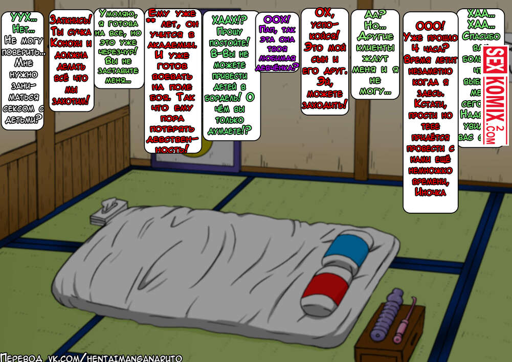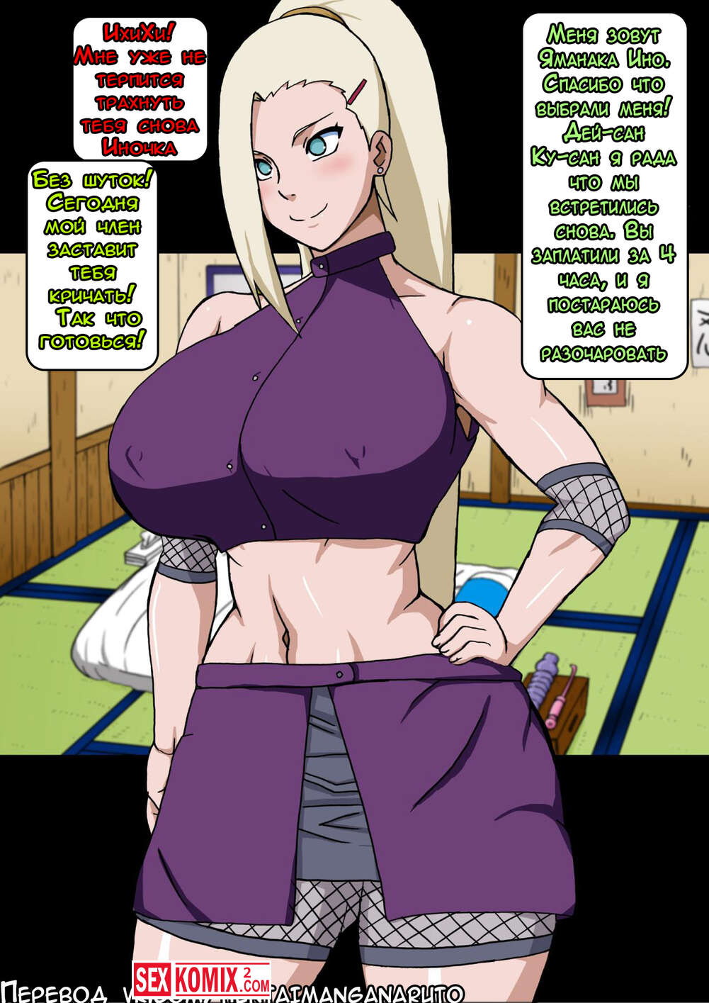 Порно комикс Наруто. Новое руководство для взрослых. Часть 2. Развратная блондинка Ино не слабо подсела на огромный член мужчины и готова была на все лишь бы ей выебал. Даже на секс втроём.