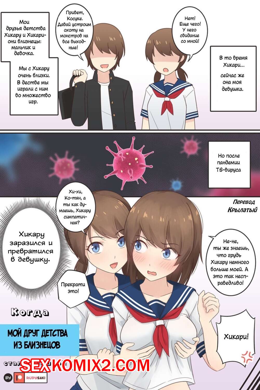 Порно комикс Когда мой друг детства из близнецов стал девушкой. Rudy Saki Юный парень превратился в девушку и теперь он выглядит как своя сестра близнец. Она обратилась за помощью к братику и попросила его пойти на свидание со своим парнем.