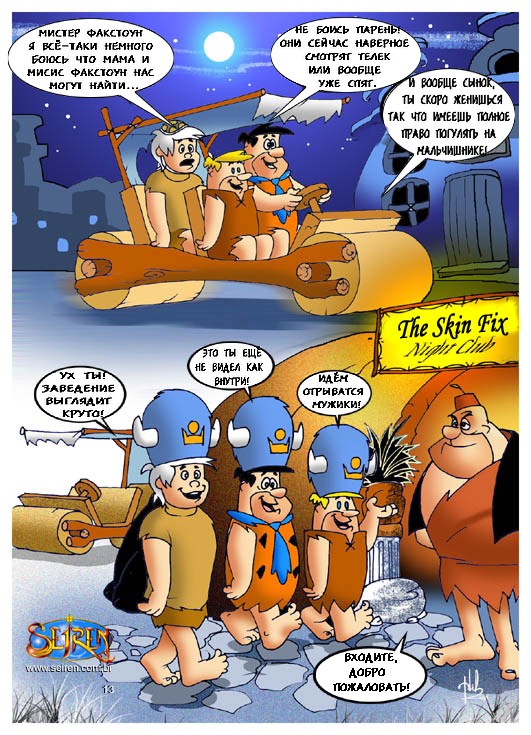 Порно комикс «Флинстоуны (The Flintstones)». Смотрите комикс онлайн пародия на знаменитый мультфильм. Берни и Фред собрались в тайне от своих жен сходить в ночной клуб, но случайно проболтались. И их сексапильные женщины решили тоже сходить в этот клуб, но чтобы мужья их не узнали, они надели маски. В то время, когда парни уже во всю веселились и прилично выпив, заказали проституток, им привели их жен. Охранник на входе по ошибке перепутал их со шлюхами. И мужья думаю, что это чужие девушки принялись трахать своих собственных жён.