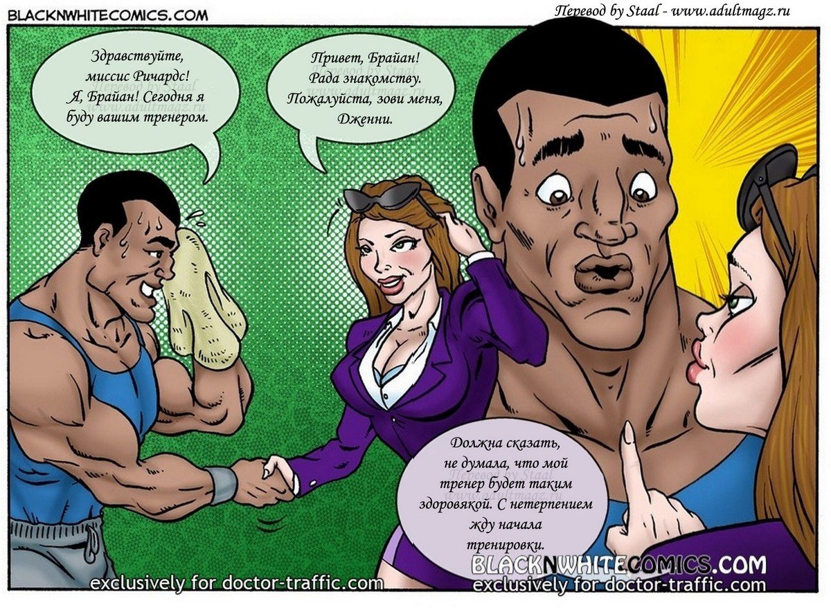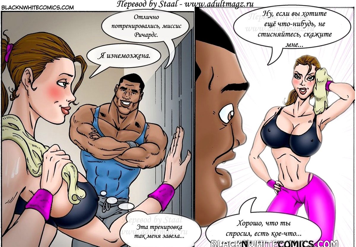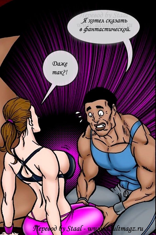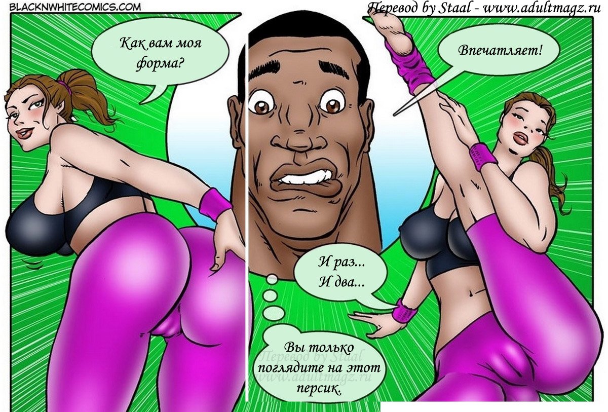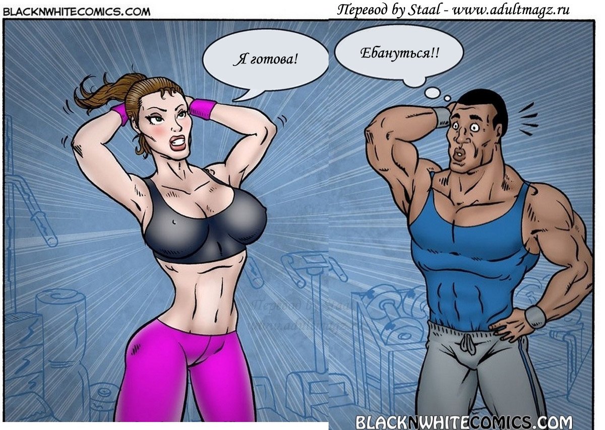 Порно комикс «Фитнес клуб Экстрим. Часть 2». Этот секс комикс о возбуждающей женщине, она пошла позаниматься спором в фитнес клуб. И записалась чернокожему тренеру на персональные тренировки. Когда она приступили к занятию, чернокожий парень ахренел от такого сочного тела, его черный змей начал набухать. А красотка продолжала тренировку не подозревая, что у тренера уже стояк на её большие сиськи и задницу. Она случайна наткнулась попкой на большой член мужчины и сразу поняла что это. В зале никого кроме них больше не было, и она приспустила трусики, чтобы окончательно добить тренера, он не выдержал и бросился на неё.