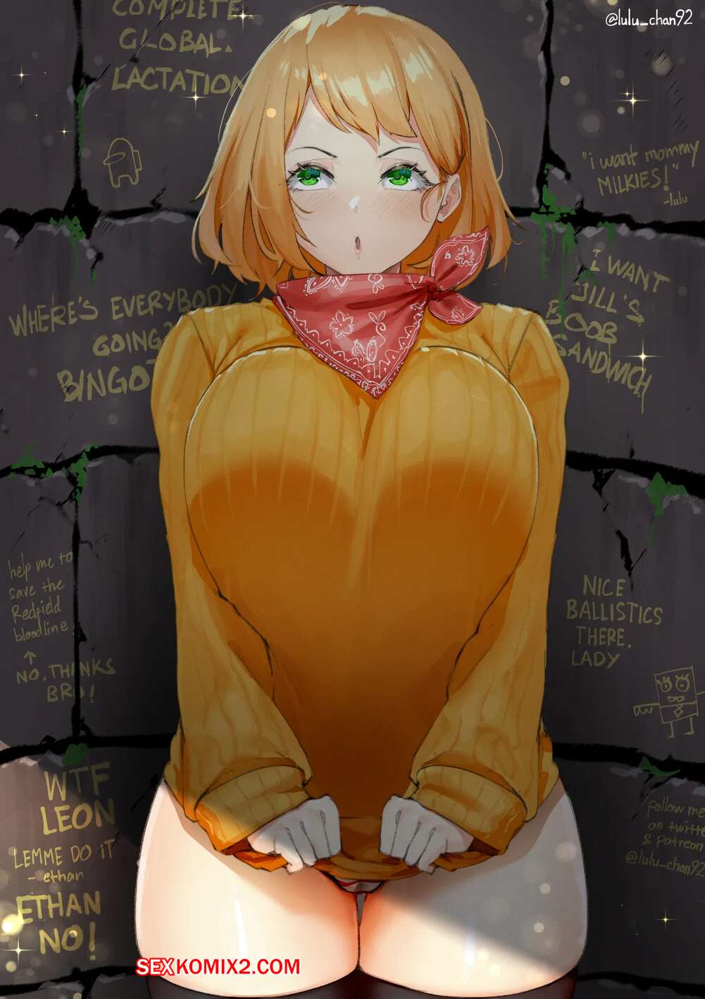 Порно комикс Ballistits. Resident Evil 4. Lulu Chan92 Горячая блондинка была очень возбуждена и решила повеселиться со своим дружком. Она разделась и возбудила его большими сиськами, после чего помогла ему кончить.