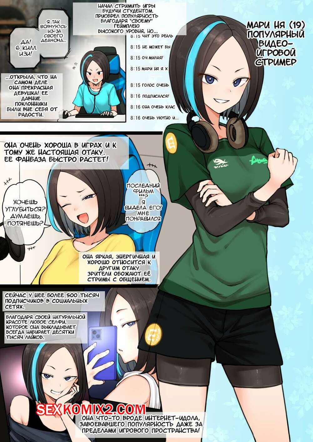 Порно комикс Сексуальная интрижка популярного игрового стримера. Terasu Mc Горячая брюнетка была очень возбуждена и решила повеселиться со своим дружком. Она разделась и возбудила парня шикарным телом, после чего дала себя как следует выебать.