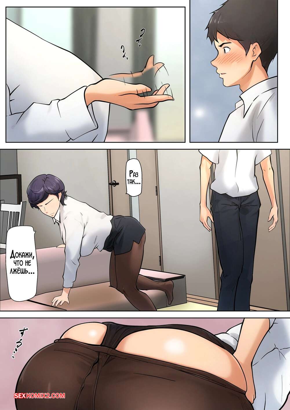 Порно комикс У меня нет другого выбора, кроме как заняться сексом с мамой. Часть 4. Shimipan Красотка милфа возбуждена и хочет секса. Она сняла трусики и встала раком перед сыном, приглашая его трахнуться. Парень долго не думал и поспешил выебать сисястую мамочку.