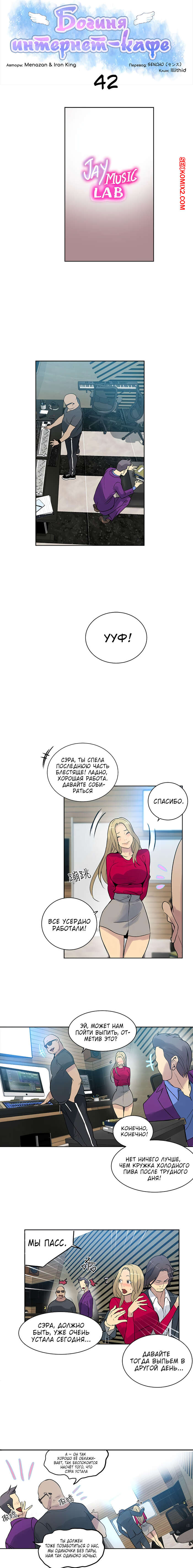 Порно комикс Богиня интернет кафе. Часть 42. Девушка отлично исполнила песню перед зрителями её босс позвал красотку сходить в ресторан в качестве благодарности. Но её перехватил красавчик из зала и забрал блондинку в свой люкс номер.