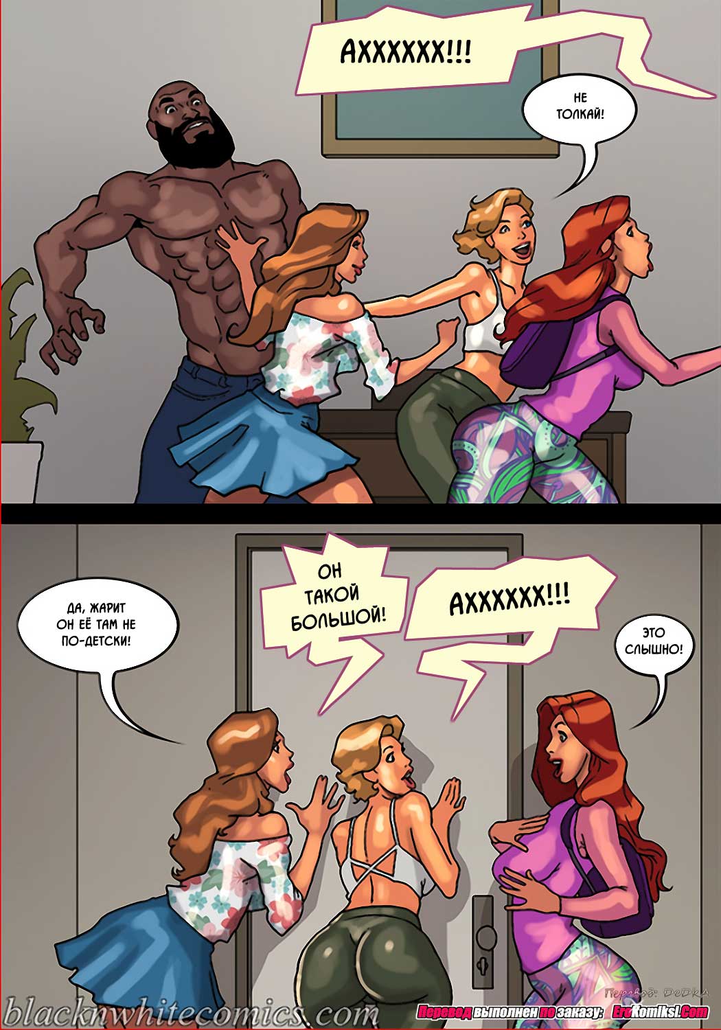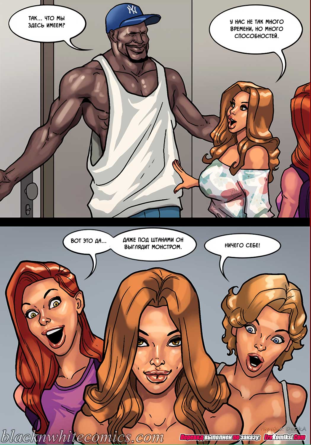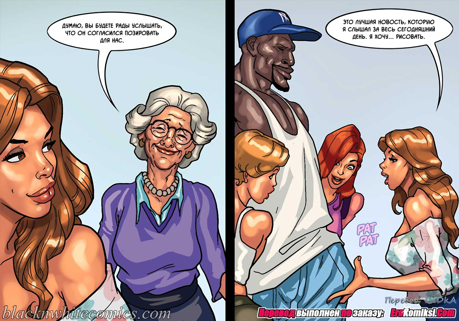 Порно комикс «Художественный кружок. Часть 2». В прошлой части комикса сексуальные художницы приглашали чернокожего парня, чтобы нарисовать его голое тело. Но они так сильно возбудились, что захотели заняться с ним сексом в чём он им не отказал и они славно потрахались все вместе. Теперь эти же художницы организовали выставку с картинами, на которых был изображён этот парень и они пригласили его посетить эту выставку, на которой девушки снова захотели отведать чёрного члена. Они принялись таскать бедного паренька в туалет по очереди и насаживаться на него своими мокрыми кисками.