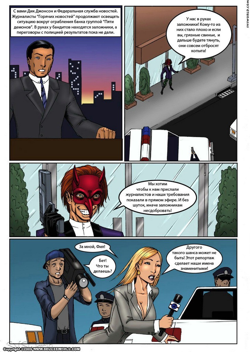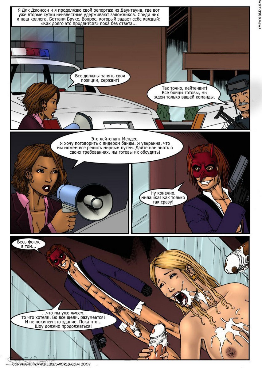 Порно комиксы онлайн «Горячие новости». По городским новостям специальное включение, вооруженная группировка преступников проникли в городской банк и взяли в заложники много людей. На место происшествия отправили горячую репортёршу, когда она приехала, сражу же начала вести репортаж возле здания банка. В это время её увидел в окно лидер этой группировки и выдвинул требования отправить репортершу к ним или он убьёт заложников. Полиции ничего не оставалось делать как отправить девушку туда. Она нужна была преступникам, чтобы развлечься с ней. Парни раздели её до гола и трахали по очереди в жесткой форме.