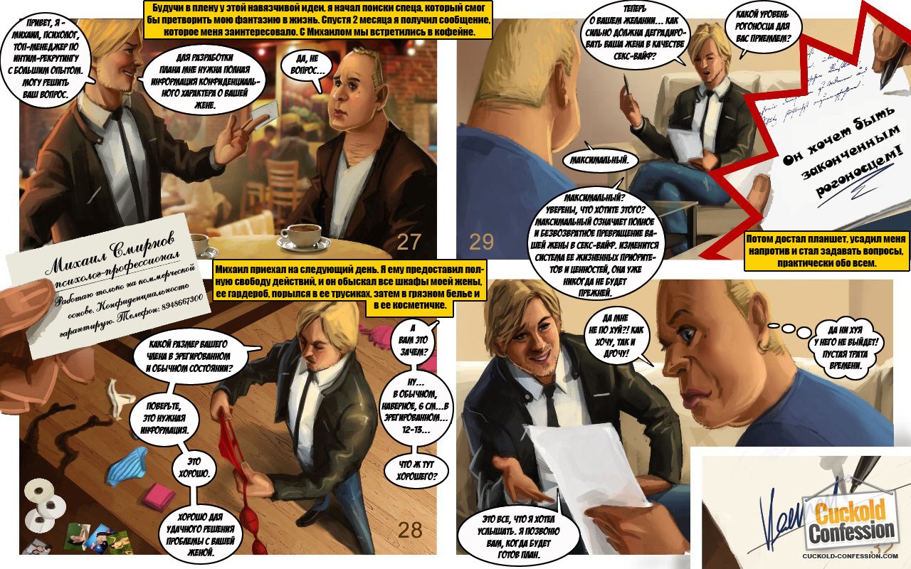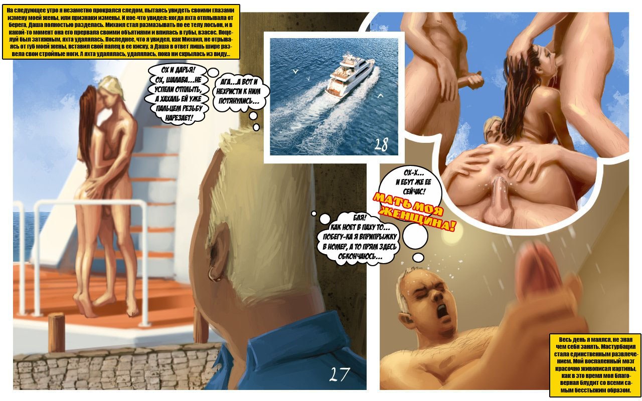Секс комиксы против «Исповедь рогоносца». Молодая, сексуальная девушка замужем за богатым, но очень взрослым мужчиной он старше ее на 20 лет. Пара постоянно ездит туристические поездки за границу, и пока мужчина находится на работе, его молодая жена ходит на пляжи, там она знакомится с молодыми парнями. И в тайне от мужа занимается с ними сексом, но совершенно случайно муж узнает о том, что его жена ему изменяет. Его это не злит, а наоборот возбуждает, и следующий раз мужчина сам предлагает ей заняться сексом с незнакомым парнем. Но при этом хочет присутствовать, при этом процессе. Извращённое девушки очень нравится это предложение, и она с удовольствием соглашается.