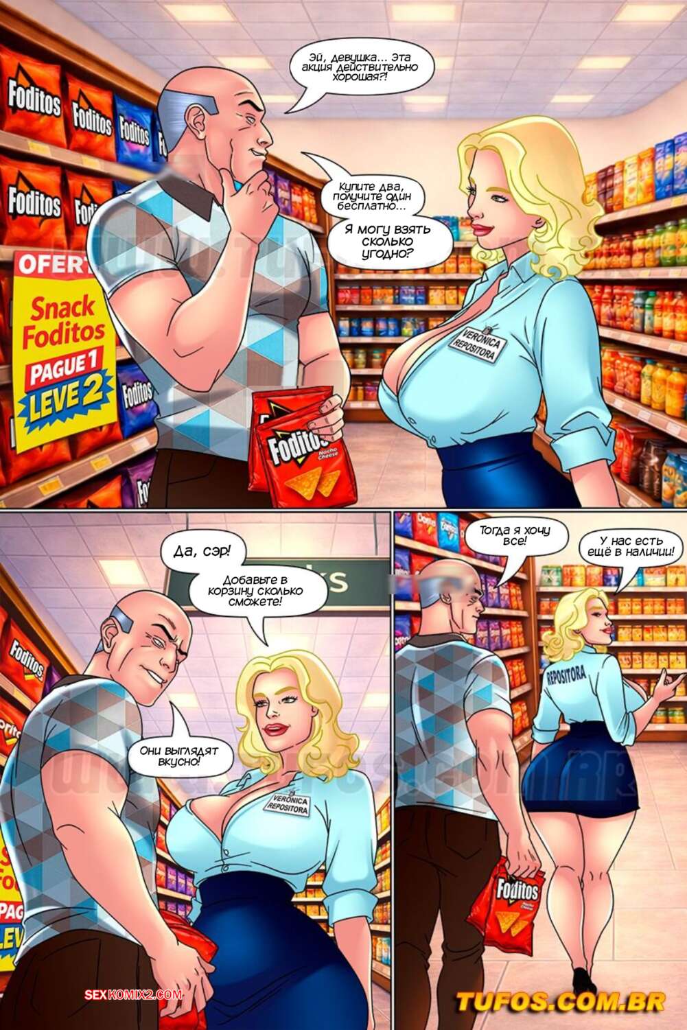 Порно комикс Закуски Папито. Часть 1. Papito Snacks. Tufos Папито отправился в супермаркет, чтобы купить себе чтото перекусить. Там он положил глаз на аппетитную блондинку и соблазнил ее своим большим хуем, желая выебать попку девушки.
