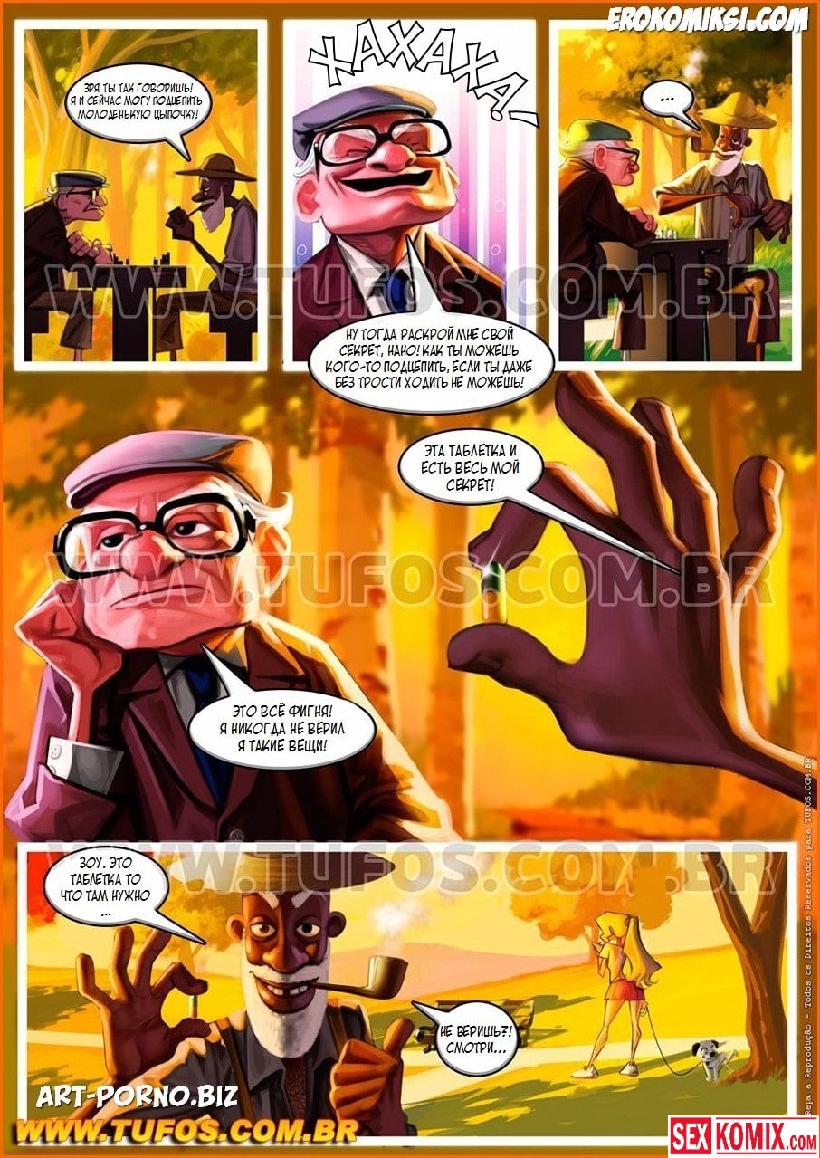 Порно комикс Удалые старички. Часть 1. Пилюли любви. Двое развратных старичков невинно играли в шахматы, в парке. На улице уже темнело, и им хотелось что-то поинтересней, дедки начали обращать внимание на девушек проходящих мимо. И заметили, блондиночка совсем одна, она хочет мужской компании. Они подошли, чтобы познакомиться с ней, но она рассмеялась. Сказала, что они старые, её не будет неинтересно. но когда они достали свои большие и твёрдый член, девушка очень сильно удивилась, как у таких пожилых мужчин до сих пор может стоять член. Весь секрет таился в пилюлях, которые они принимают.
