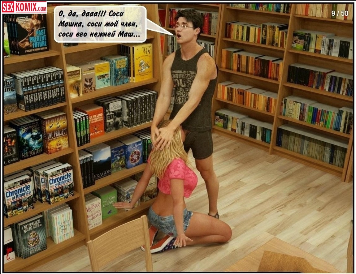 Порно комикс Секс в библиотеке. Ни в чём не подозревающий студент университета пошёл библиотеку, чтобы готовиться к дипломной работе. Там ему повстречалась сексуальная блондинка, которая начала строить ему глазки и заигрывать с ним. Парень не должен был отвлекаться на неё, так как ему уже нужно было готовиться к учёбе. Но девушка была настойчива, она прижалась своей большой грудью к его телу, от этого парень очень сильно возбудился. Они уединились в дальней части библиотеки, чтобы заняться горячим сексом.