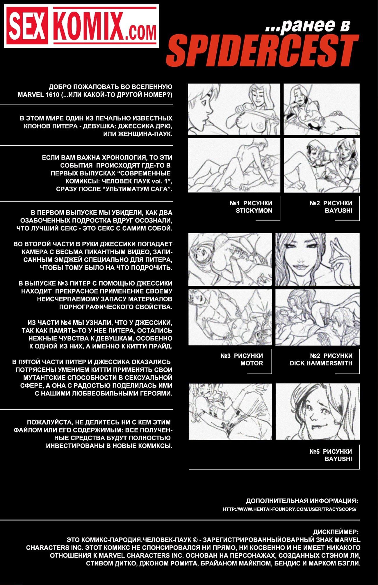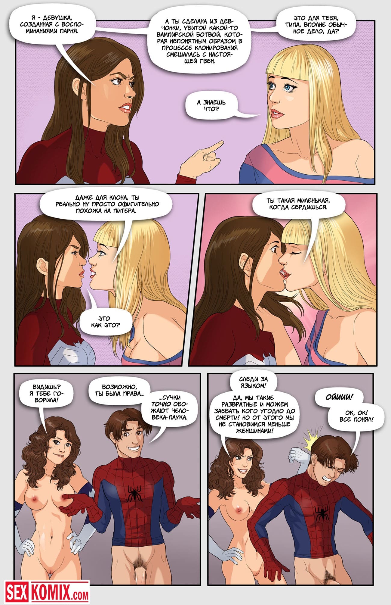 Порно комиксы Совершенный человек паук. Часть 6. После долгой ночи сексуальных утех Питера и его двух горячих подружек, они уснули. Они проснулись от женского голоса, это была девушка Питера, Мэри Джейн. Она не ожидала застать своего парня с двумя красотками, но все же она не сильно расстроилась. Мэри давно хотела попробовать секс с девушкой, а тут их даже две. Питер пригласил свою избранницу в кровать и они устроили супергеройскую оргию.