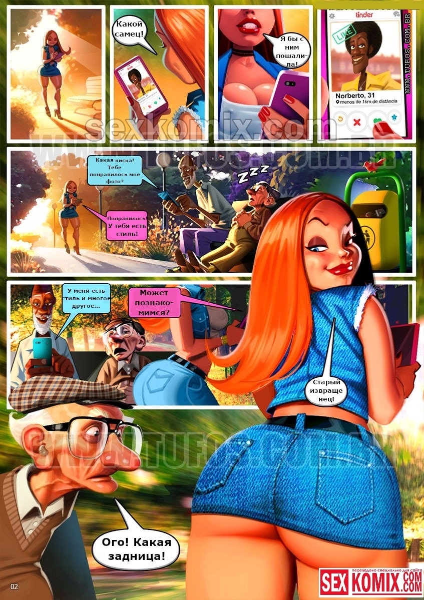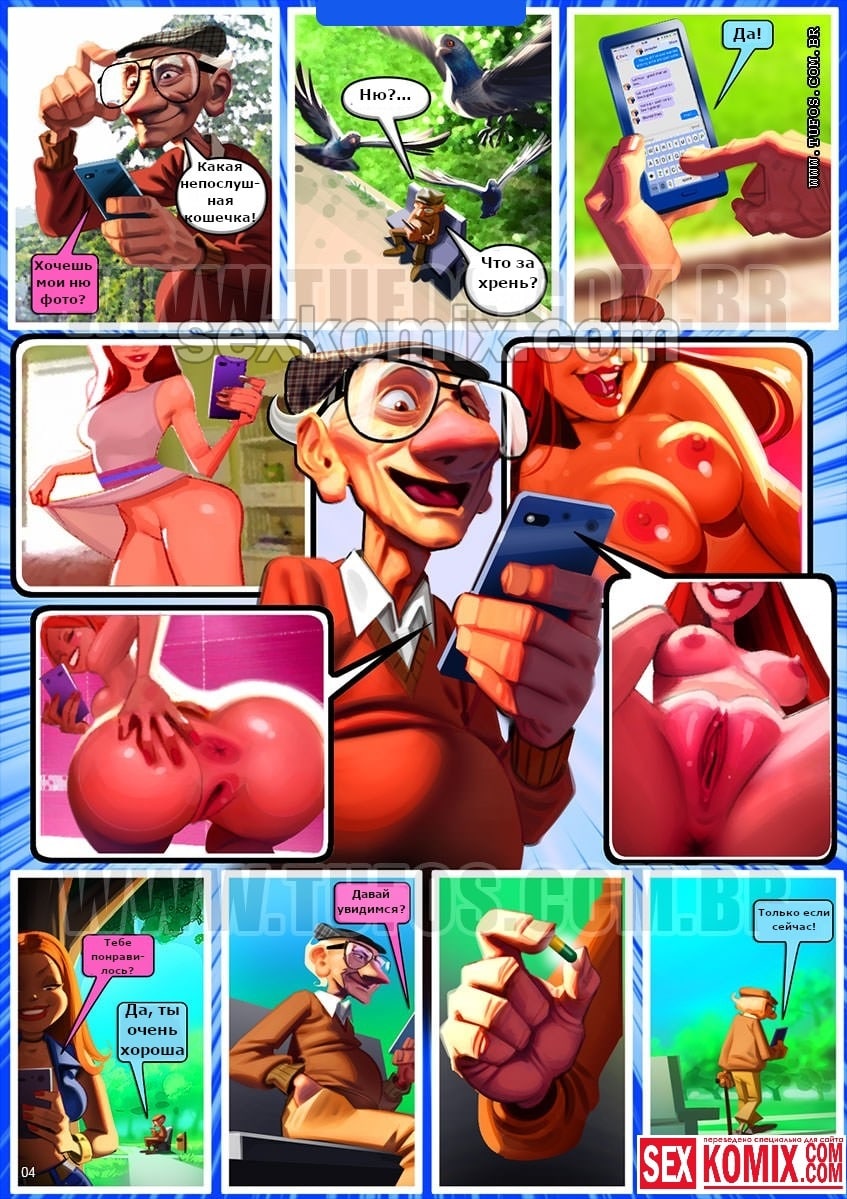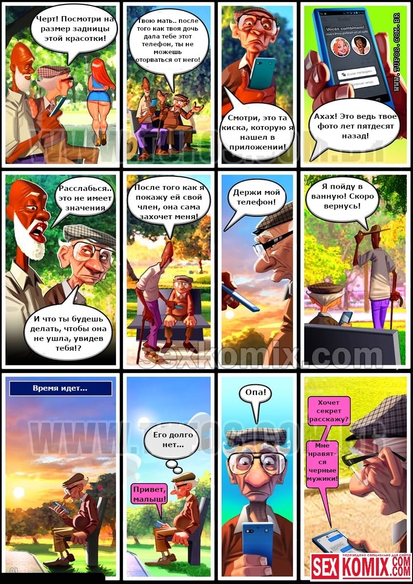 Порно комикс Удалые старички. Часть 5. Сайт Знакомств. Девушка хотела познакомиться с мужчиной в интернете, и зарегистрировалась на сайте знакомств. Ей попалась фотография очень привлекательно чернокожего мужчины, на ней он был голый и между ног у него свисал огромный член. Девушка на это сразу же появилась и назначила ему встречу в парке. Когда она пришла туда в надежде заняться сексом с этим горячим парнем. Она наткнулась на пожилого старика, но не разочаровалась, потому что его член был до сих пор такой же большой, как и на фото.