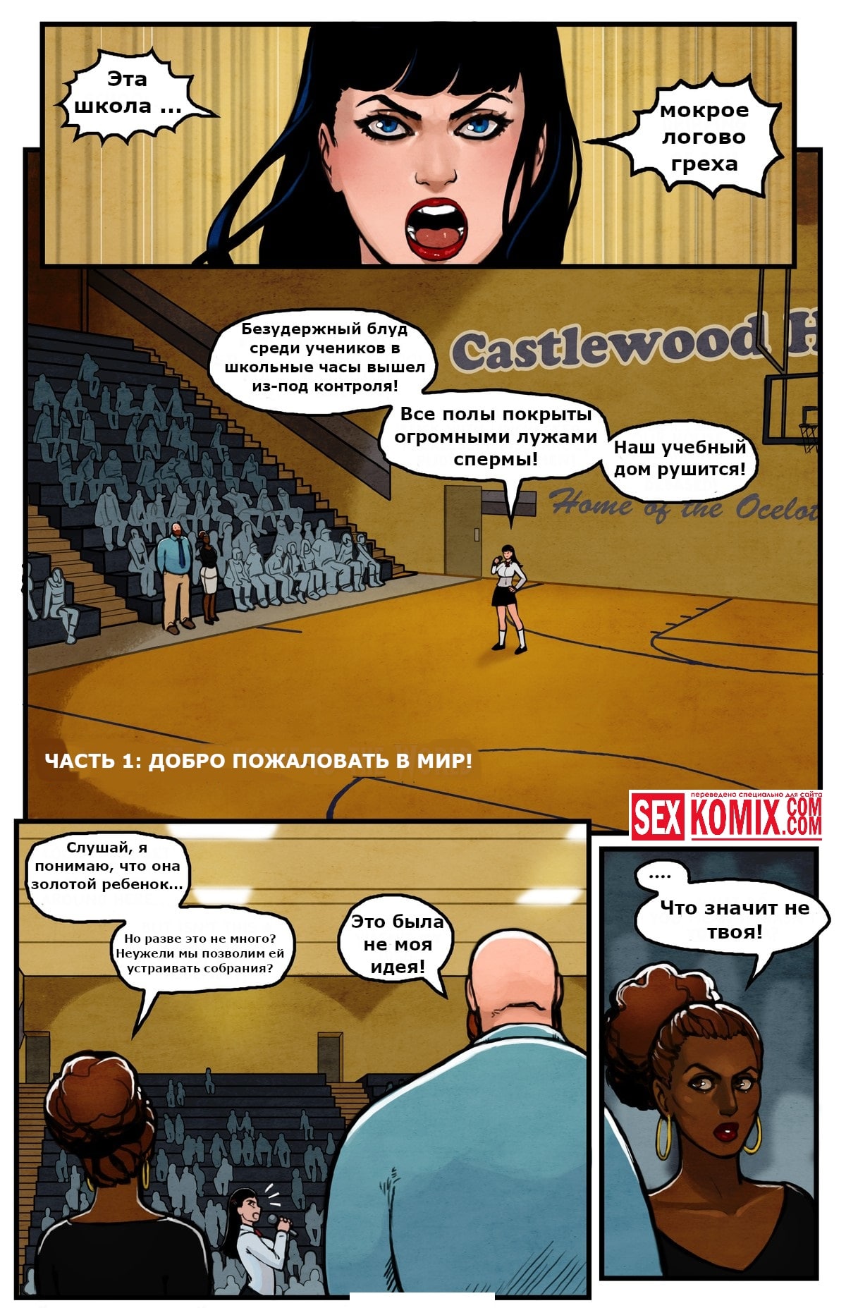 Порно комикс Романтический мир. Часть 1. Инициативная девушка собрала всех в спортивном зале, чтобы решить вопрос разврата в учебном заведении. Девушки занимаются сексом в туалете с парнями и девушки с девушками. И теперь решили штрафовать нарушителей. После такого решения озабоченные девушки стали вести себя более аккуратно занимаясь сексом. После тренировки одна красотка начала приставать к своей подруге в душе и соблазнила её, девушки ласкали груди и киски друг друга под потоками воды.