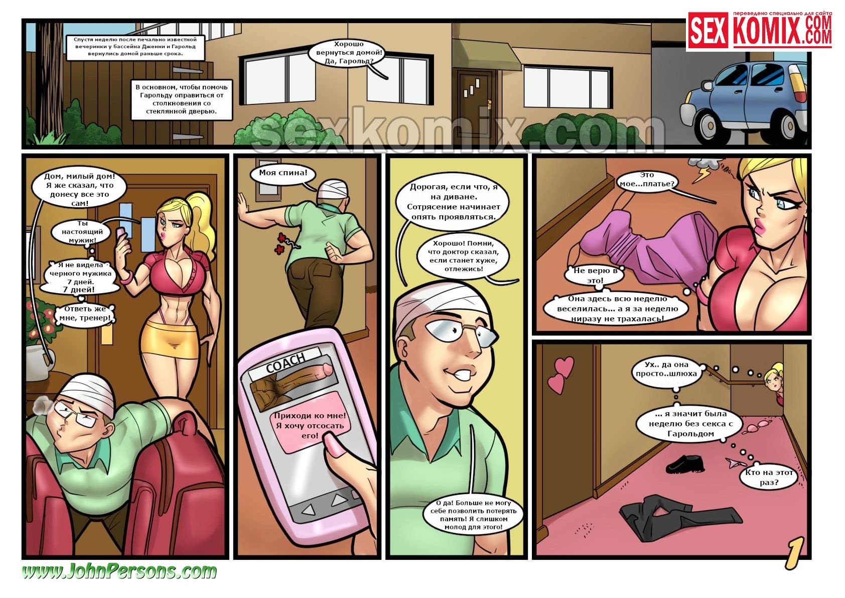 Порно комикс Коксвиль. Обмен Парнями. Очень сексуальная женщина со спортивным телосложением пригласила к себе в гости чернокожего парня, чтобы хорошенько с ним поразвлечься пока ее муж находится в больнице. Но неожиданно муж возвращается домой, и изворотливая женщина отправляет тут же его в спальню, чтобы тот ложился спать и отдохнуть после травмы. А сама возвращается в комнату к чернокожему парни с большим членом, она делает ему сочный миньет, а потом насаживается на его огромный член своей киской.